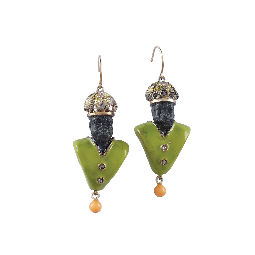 Orecchini moretti in oro rosa e argento peso 12,6 gr. onice, stesura di smalto policromo e rose di diamante