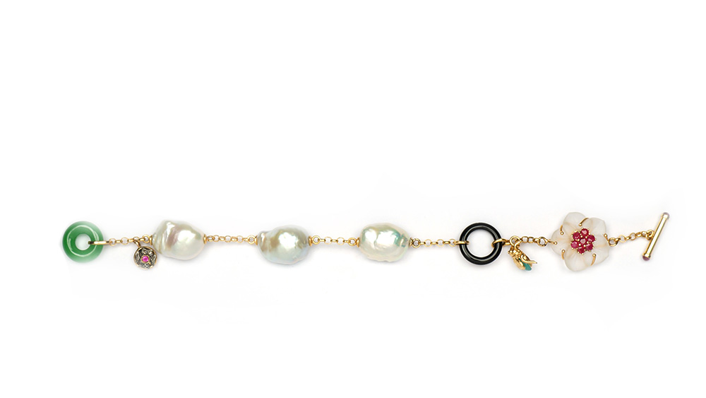 Bracciale in oro rosa 18kt e perle scaramazze peso 18,6 gr. alternate a elementi circolari in onice e giadeite, con chiusura a motivo floreale in oro cristallo di rocca e rubini tondi, completo di due pendenti a foggia di scarabeo e di fiore, lunghezza 21 cm
