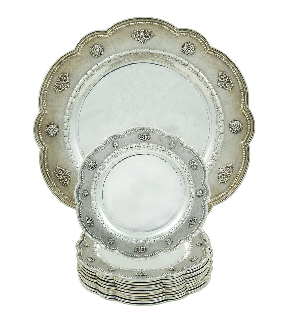 Vassoio e dodici piatti in argento Italia, XX Sec. d. 40 cm e 21,5 cm. finemente cesellati con applicazioni a motivi floreali e volute, profili godronati. Orafo argentiere Banderali Giordano, Milano, peso 4.730 gr.