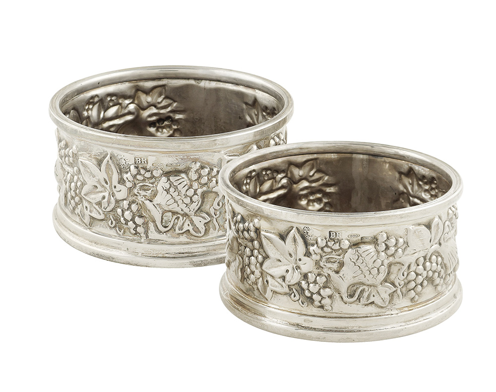Coppia di sottobottiglia in argento orafo Brandimarte Firenze, XX Sec. 5,5x10 cm. corpo circolare inciso e sbalzato a motivi di grappoli d'uva e tralci di vite, base in mogano, peso lordo 290 gr.