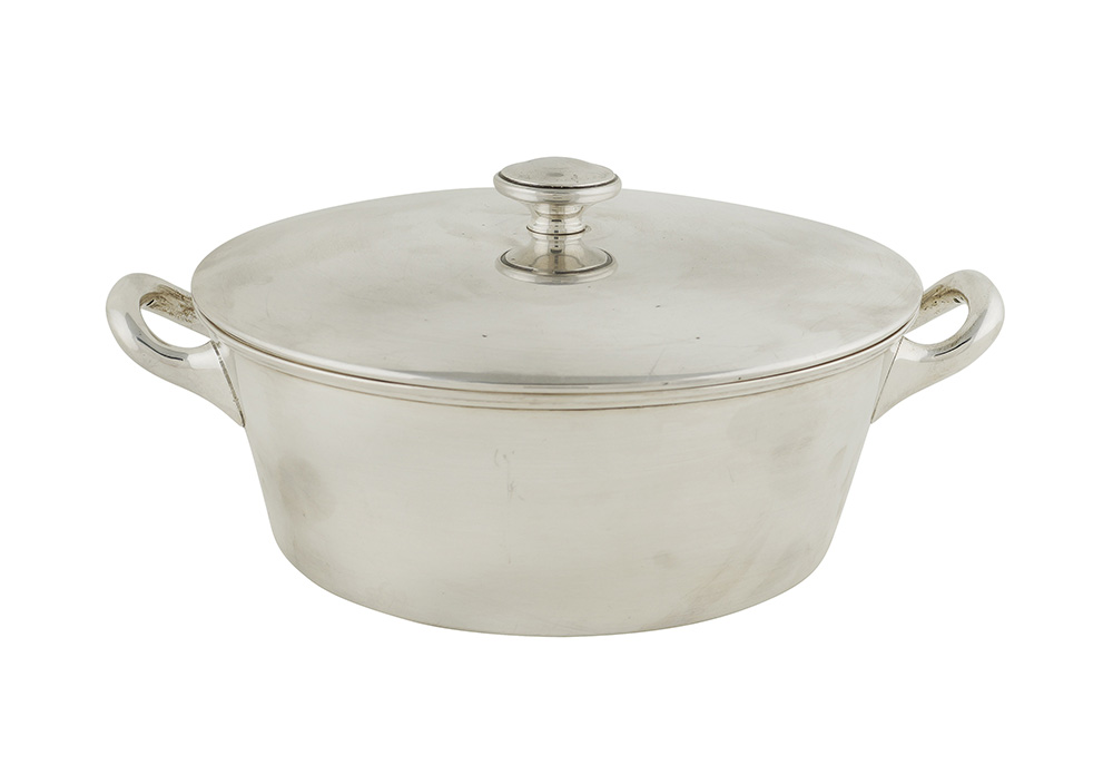 Pentola con coperchio in argento Italia, XX Sec. 10x26 cm. corpo liscio con due manici di linea tonda, peso 716 gr.
