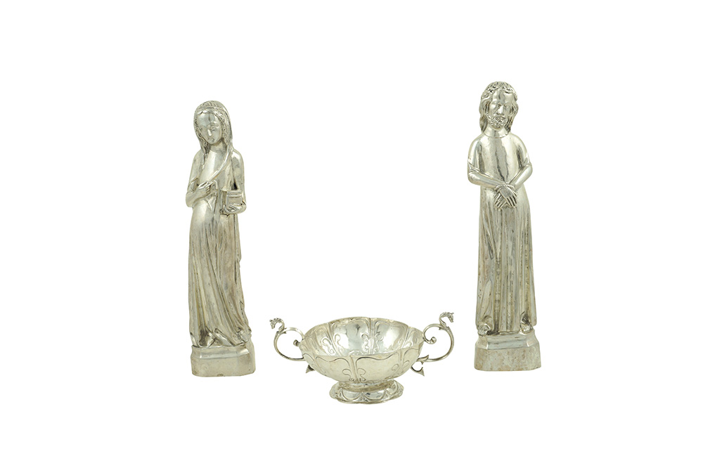 Gruppo di tre oggetti in argento peso 855 gr. composto da due sculture raffiguranti Gesu' e la Vergine Maria e un cestino, fogge, misure e manifatture diverse