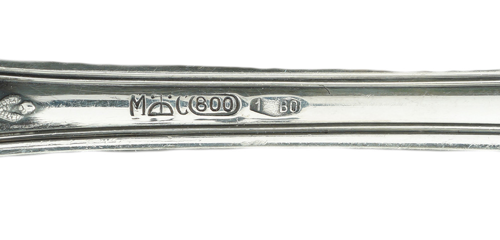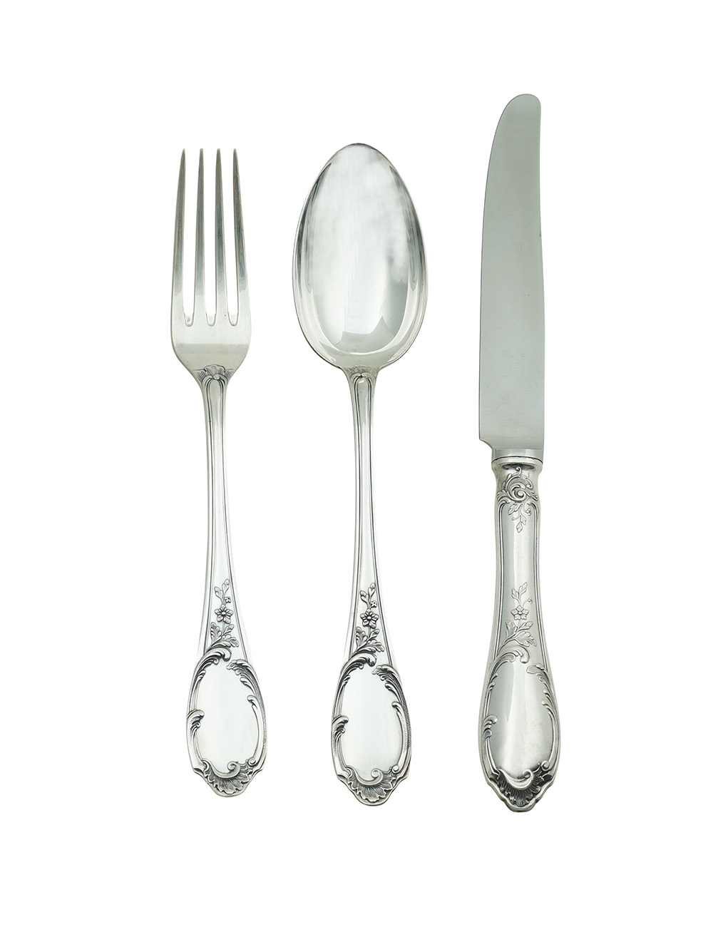 Composto da 24 forchette, 12 coltelli, 12 cucchiai, 12 forchetta da frutta, 12 coltelli da frutta, 12 cucchiaini,12 forchette da pesce, 12 coltelli da pesce, un mestolo, una paletta da dolce, una coppia di posate da legumi, una coppia di posate da arrosto e una coppia di posate da pesce