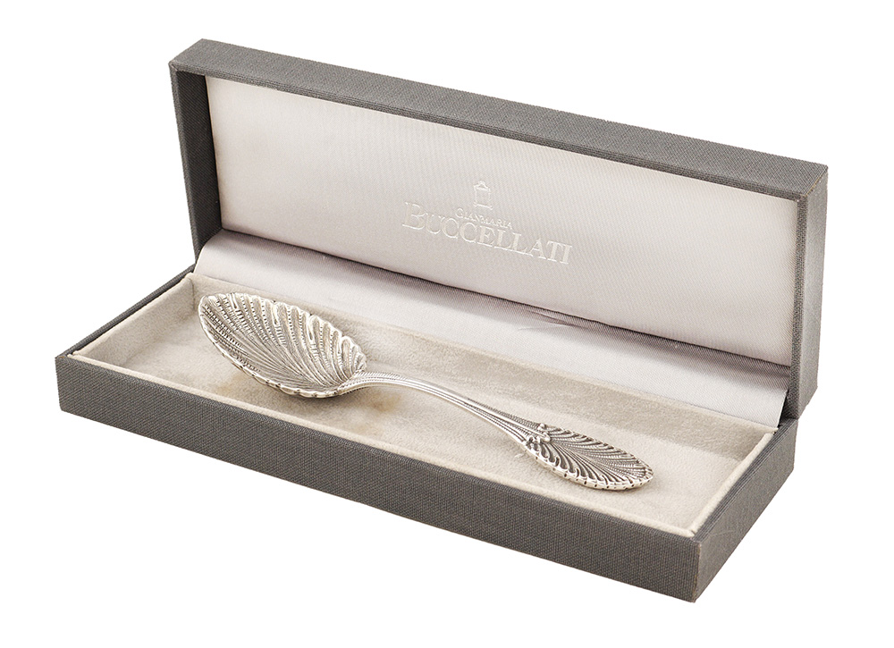 Gianmaria Buccellati Italia, XX Sec. peso 38 gr. cucchiaino in argento 925 finemente cesellato a motivi vegetali, entro scatola originale, lunghezza 13,5 cm.