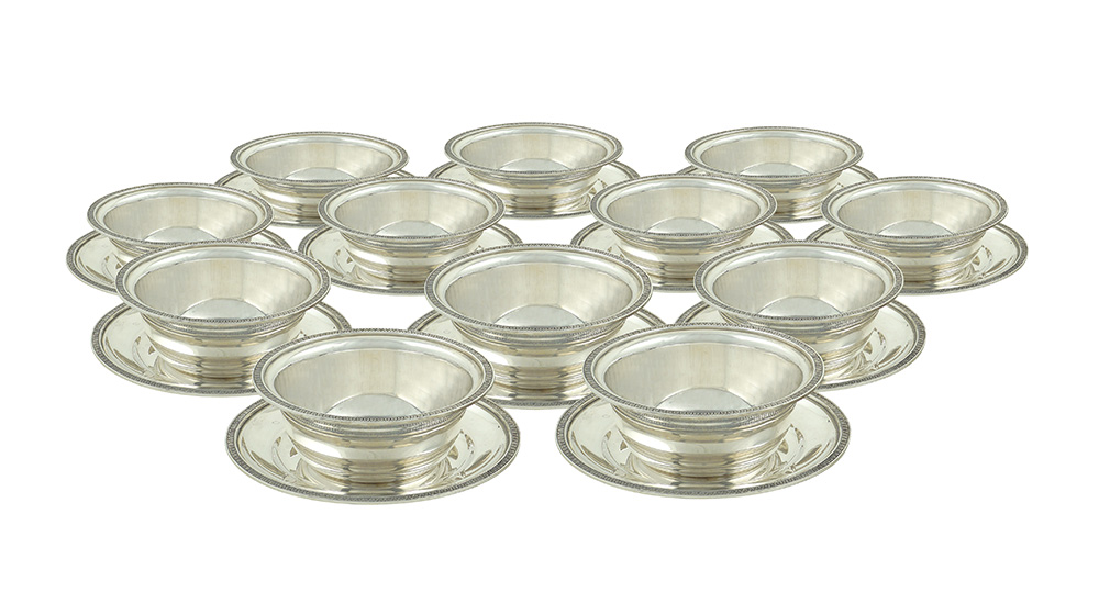 Dodici coppette in argento con relativi piattini Italia, XX Sec. profili decorati a palmette, peso gr. 3920