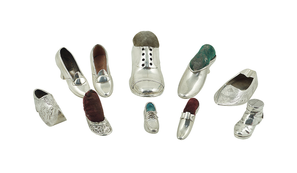 Collezione di 10 puntaspilli in argento fine XIX inizio XX Sec. peso lordo 355 gr. modellati a foggia di scarpette, manifatture e misure diverse