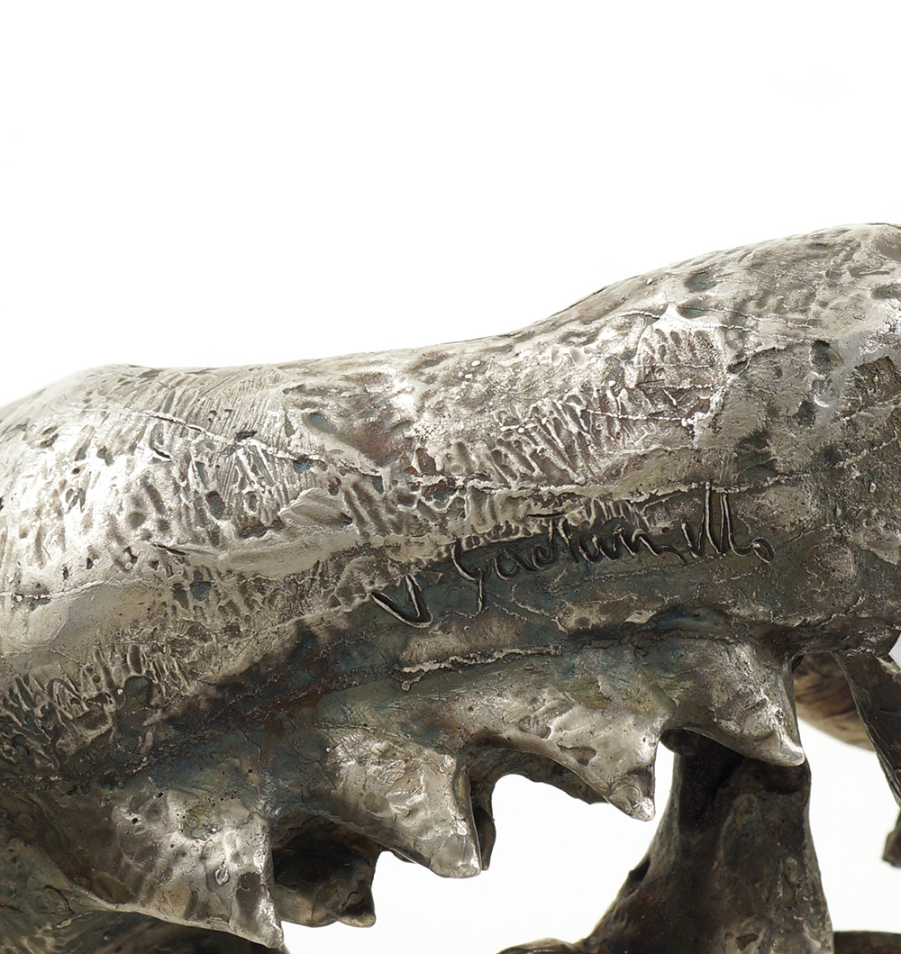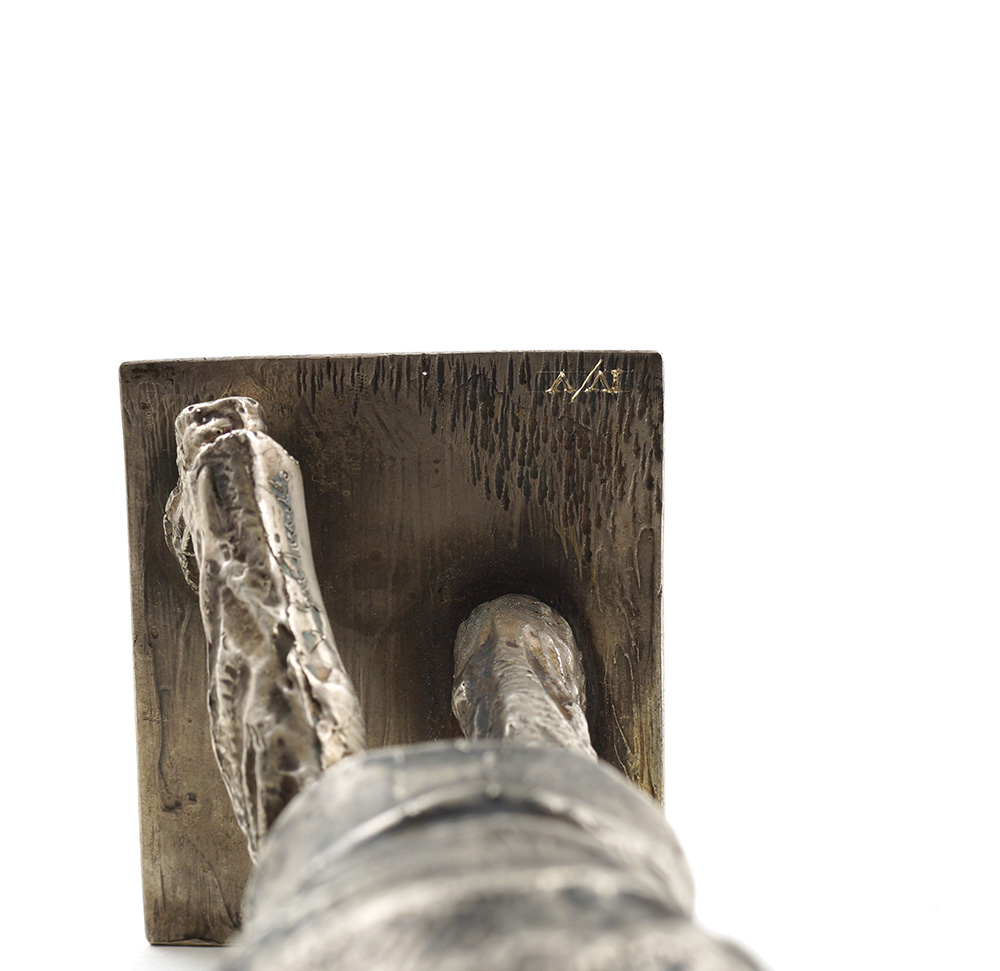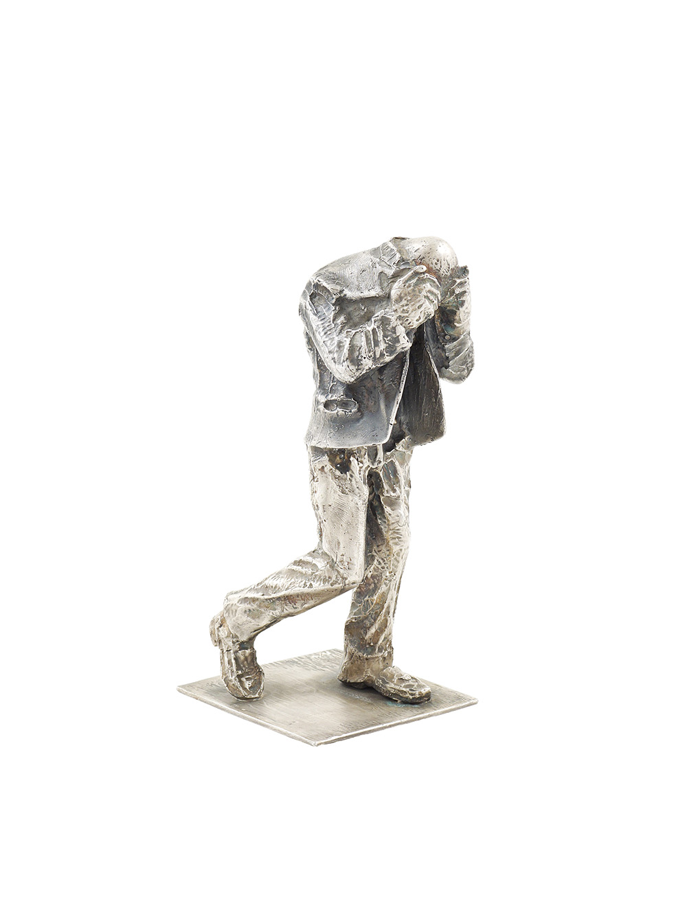 Vincenzo Gaetaniello Pomigliano d'Arco 1935 peso 490 gr. "L'uomo che si nasconde", scultura in argento es. IV/V, firmata e numerata in basso, opera ideata per la gioielleria Petochi di Roma e realizzata in argento 925 nel 1970 circa, h. cm.15