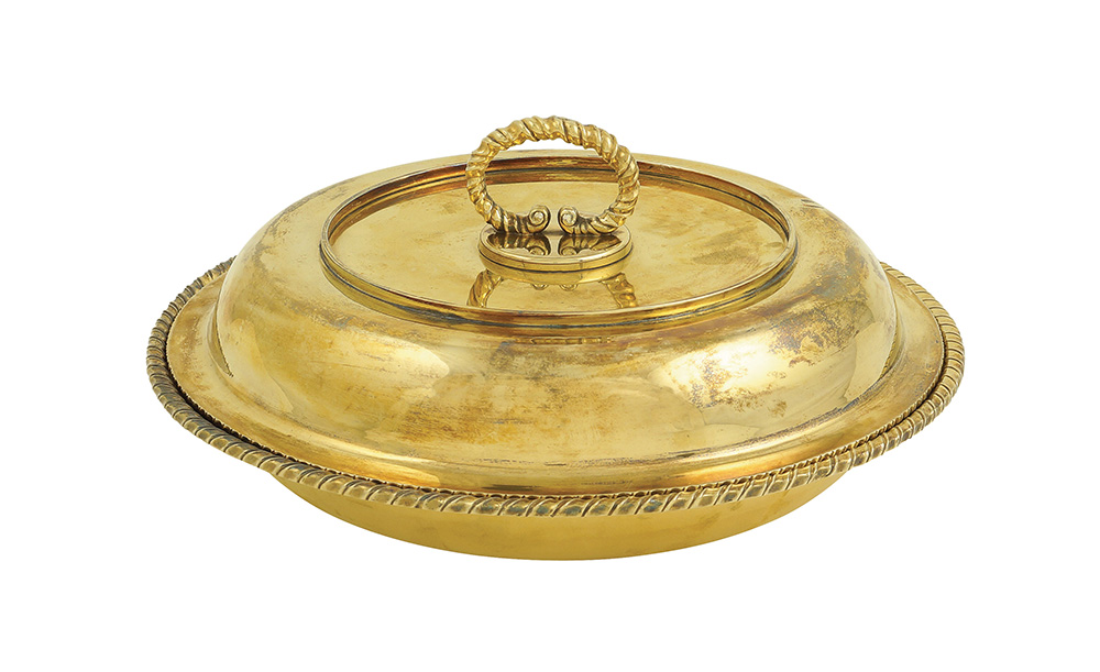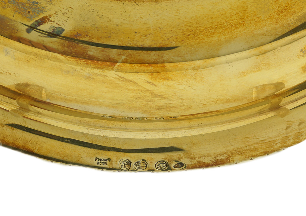 Legumiera in argento vermeil Italia, XX Sec., firmata Petochi Roma h. 11 cm. - d. 30 cm. forma circolare a corpo liscio con profilo godronato, presa a baionetta, peso 1600 gr.