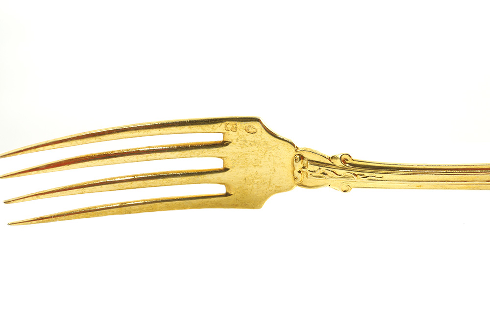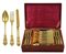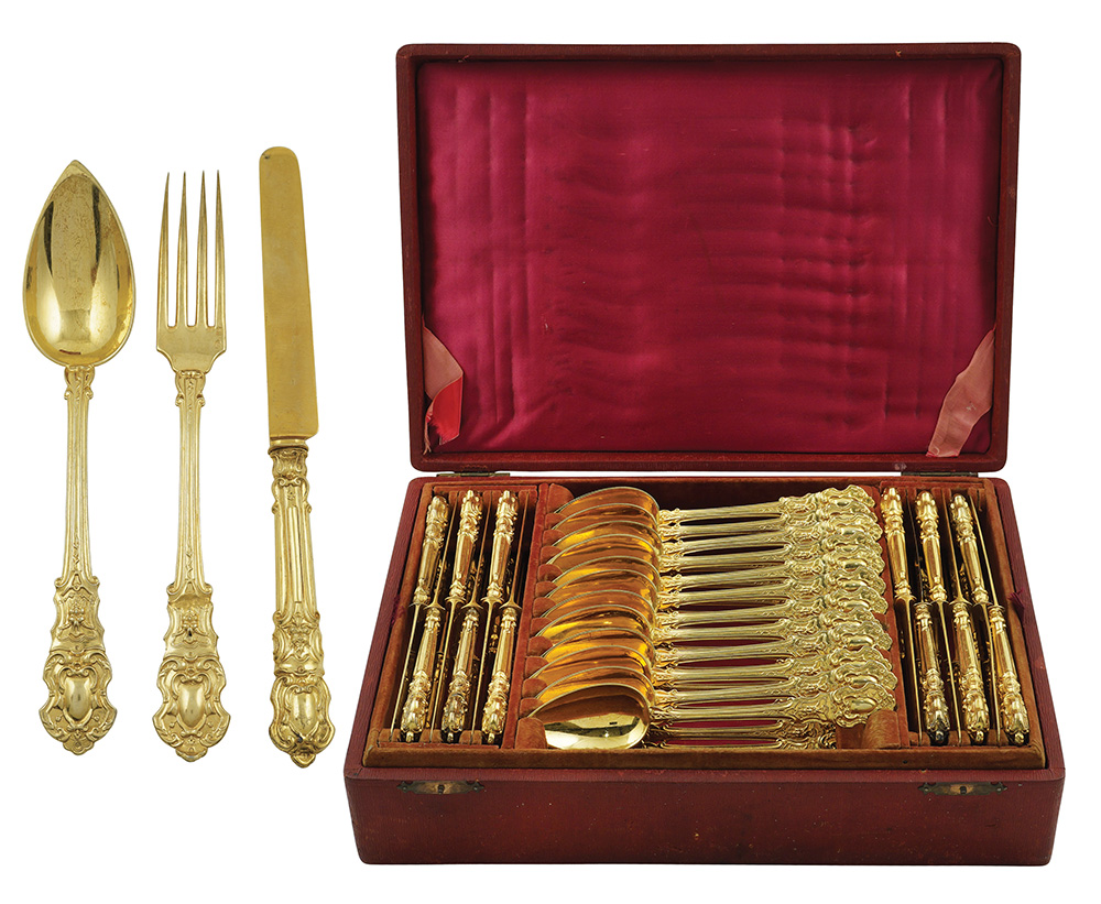 Servizio 48 posate da frutta in argento vermeil Parigi, fine XIX Sec. peso 1,490 gr. finemente cesellato con motivi a volute e mascheroni, composto da 12 cucchiai, 12 forchette e 24 coltelli entro custodia originale, reca marchi di garanzia francesi e di importazione Napoli
