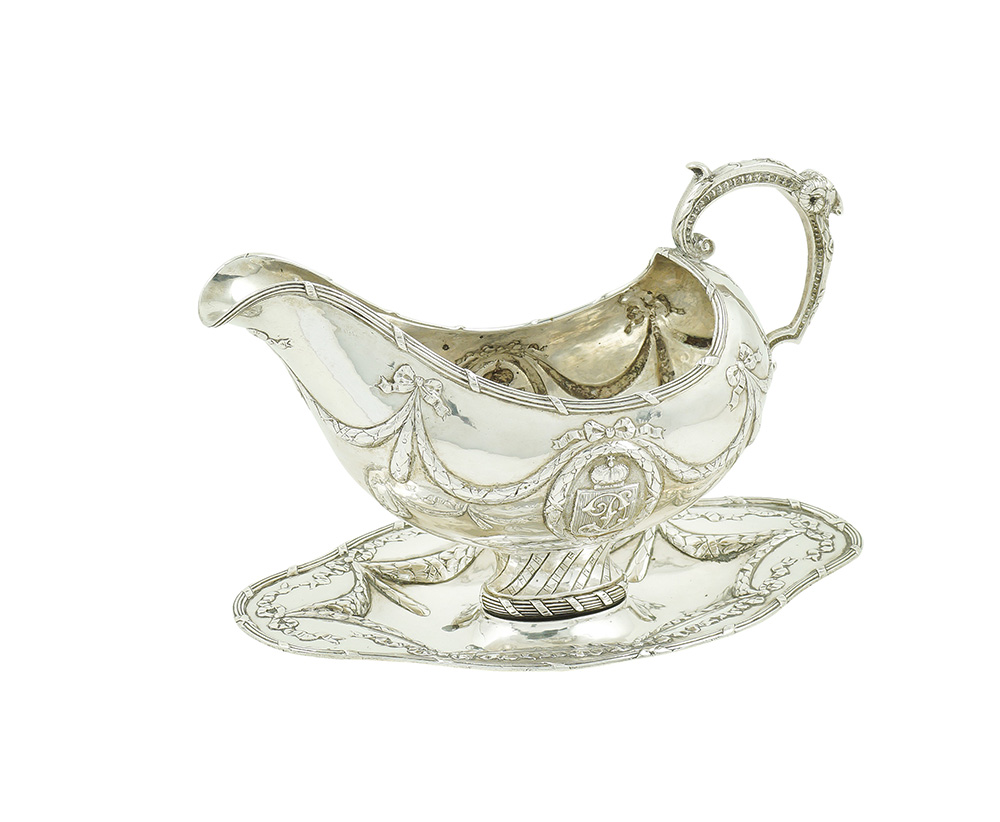 Salsiera con vassoio ovale in argento Austria, fine XIX Sec. 17,5x22x14,5 cm. corpo decorato a motivo di festoni e centrato da una stemma nobiliare, manico a voluta a foggia di testa di ariete, peso gr. 666