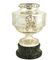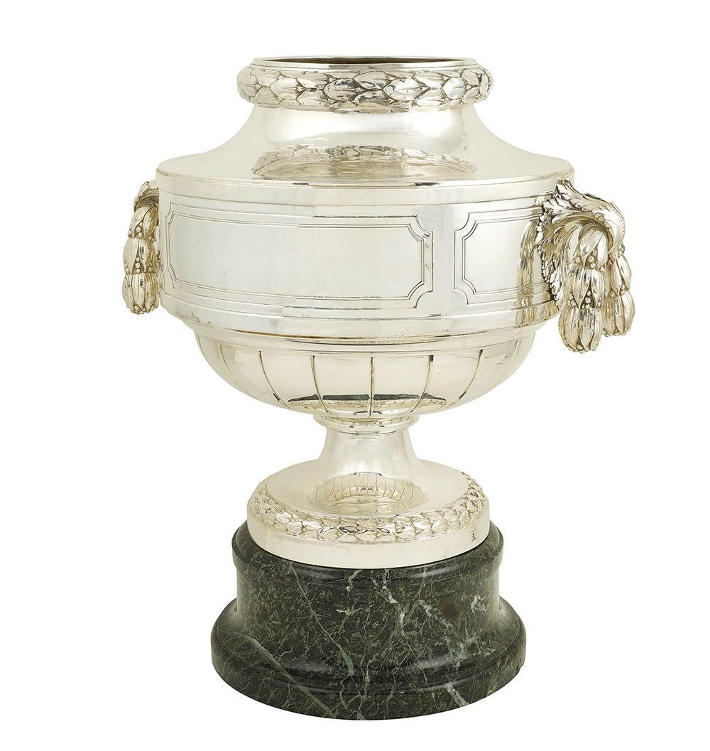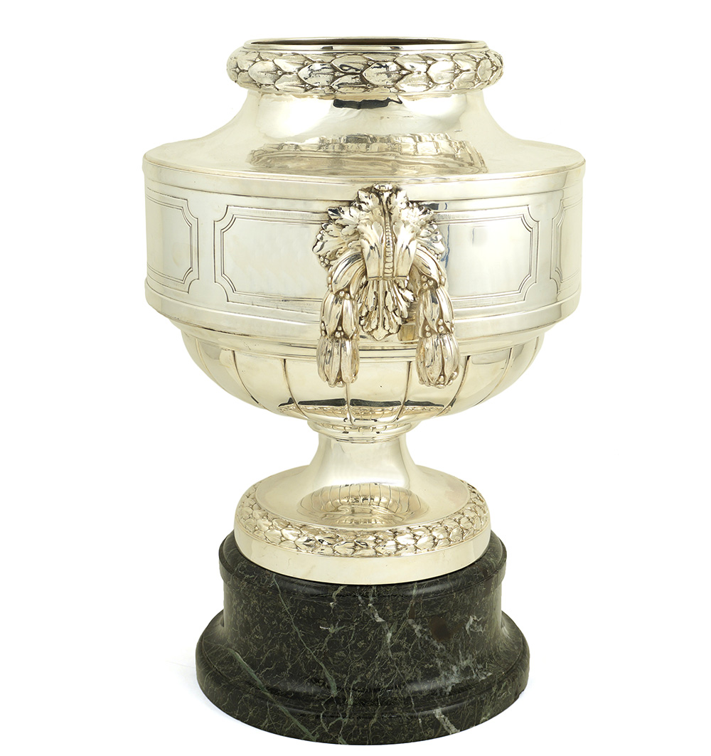 Grande coppa centrotavola in argento inizio XX Sec., firmata Pierard h. 42 cm. decorata a motivi di foglie d' alloro e poggiante su base circolare in marmo verde, peso 4800 gr.