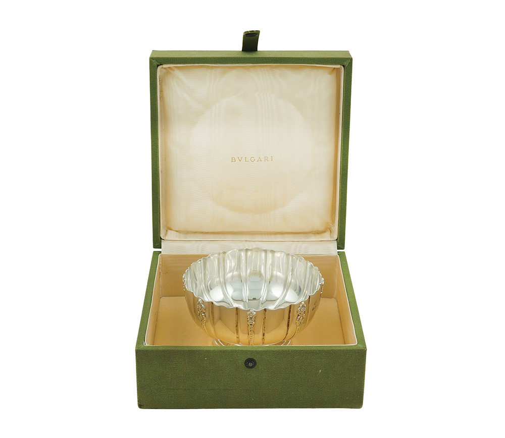 Bowl in argento Birmingham, 1914 peso 185 gr. corpo baccellato e decorato a volute su base circolare, entro custodia Bulgari, h. 6 cm., d. 10 cm.