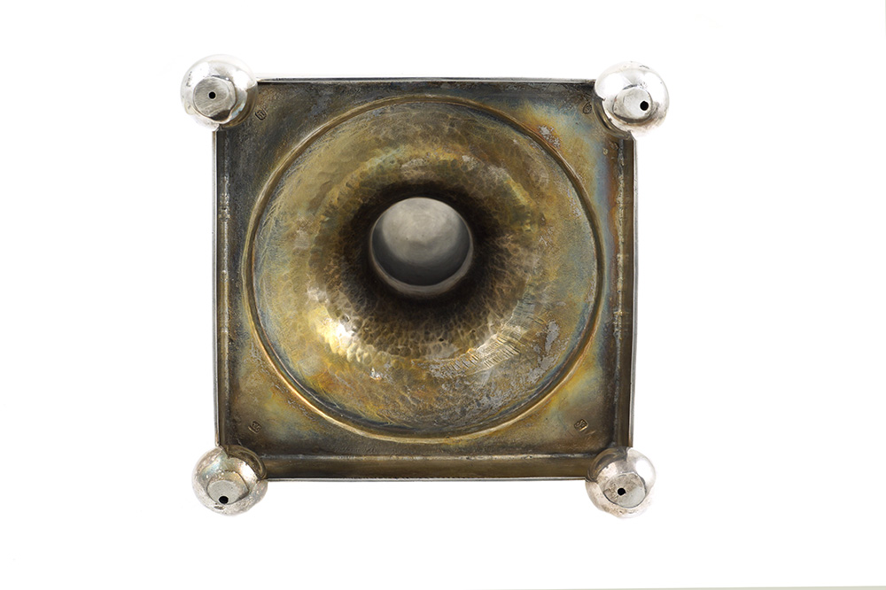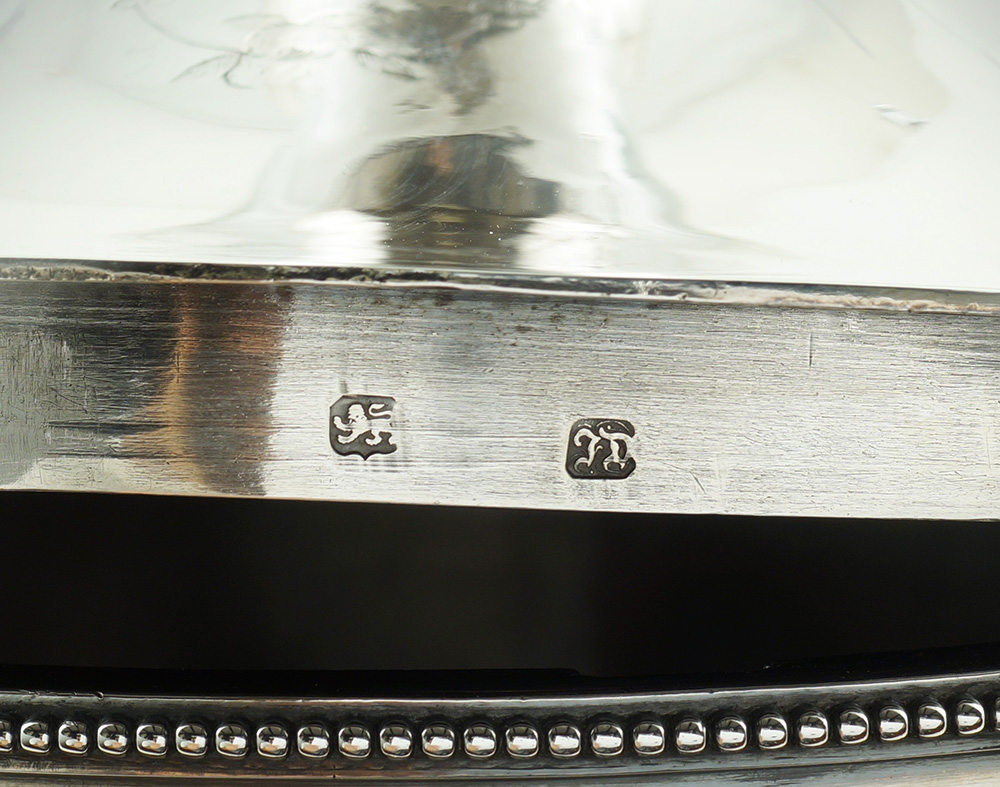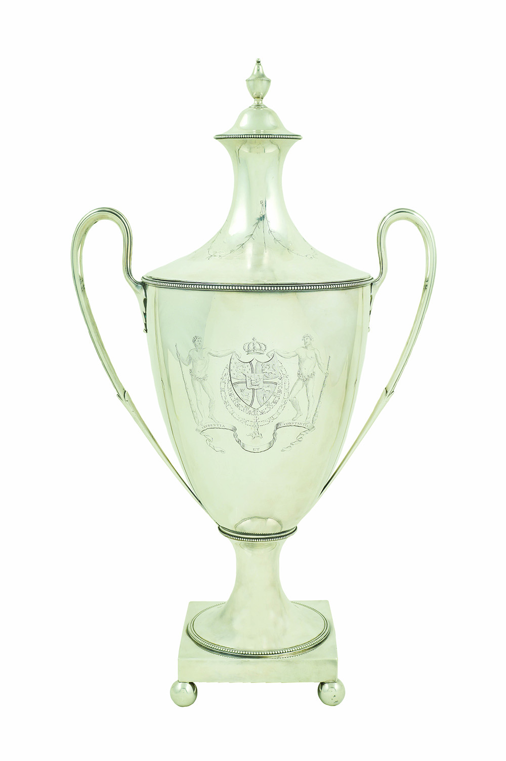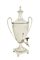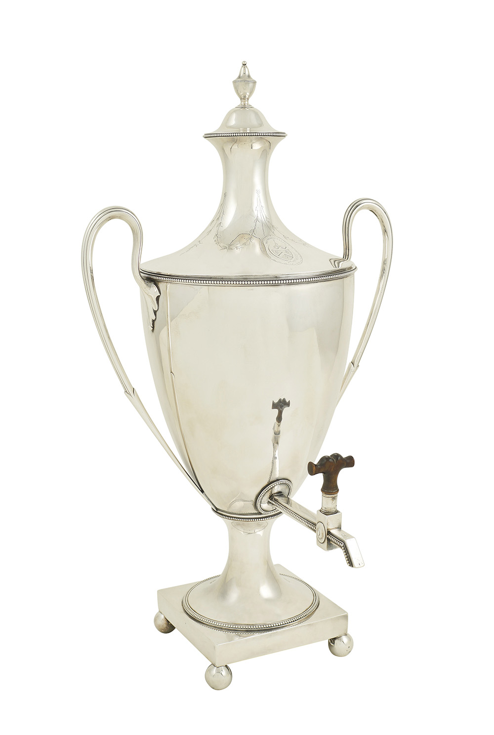 Samovar in argento a due manici Londra, Giorgio III 1784 h. 60 cm. corpo liscio decorato con lo stemma di Federico V di Danimarca, base squadrata poggiante su quattro piedini a sfera, manici a voluta, coperchio con presa a balaustro e decorato con tralci floreali, peso 3230 gr.