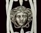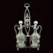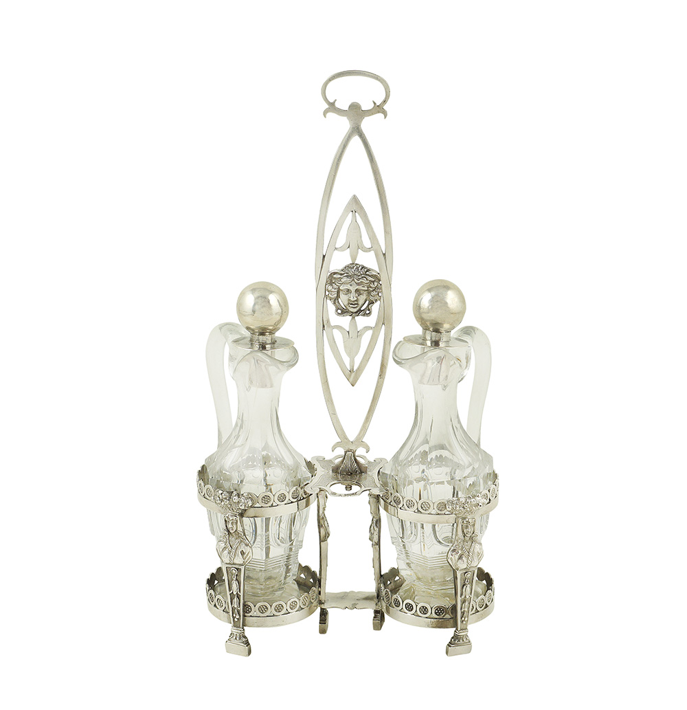 corpo finemente cesellato a motivi neoclassici con presa centrata da testa di Medusa, ai lati due bottiglie in cristallo molato (con difetti) e tappi in argento, orafo argentiere Giovanni Fedeli attivo a Roma tra il 1800 ed il 1829, peso 460 gr.