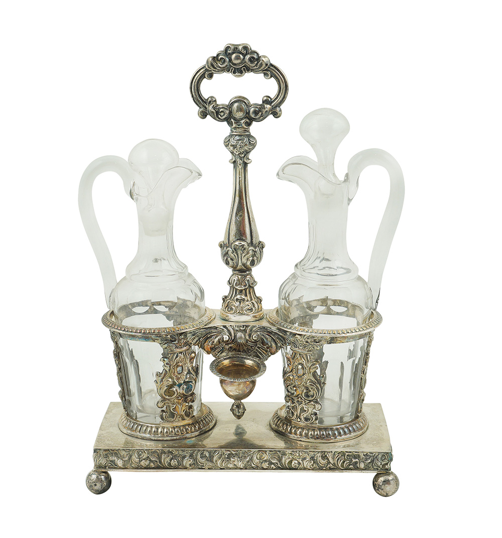 Oliera in argento Regno di Sardegna, 1824-1872 31x22x10 cm. finemente inciso e sbalzato a motivi vegetali e a volute, ampolle in cristallo molato, orafo argentiere Giuseppe Giovara Torino, reca punzoni territoriali del Regno di Sardegna e di garanzia delle Zecche Sabaude, peso 490 gr
