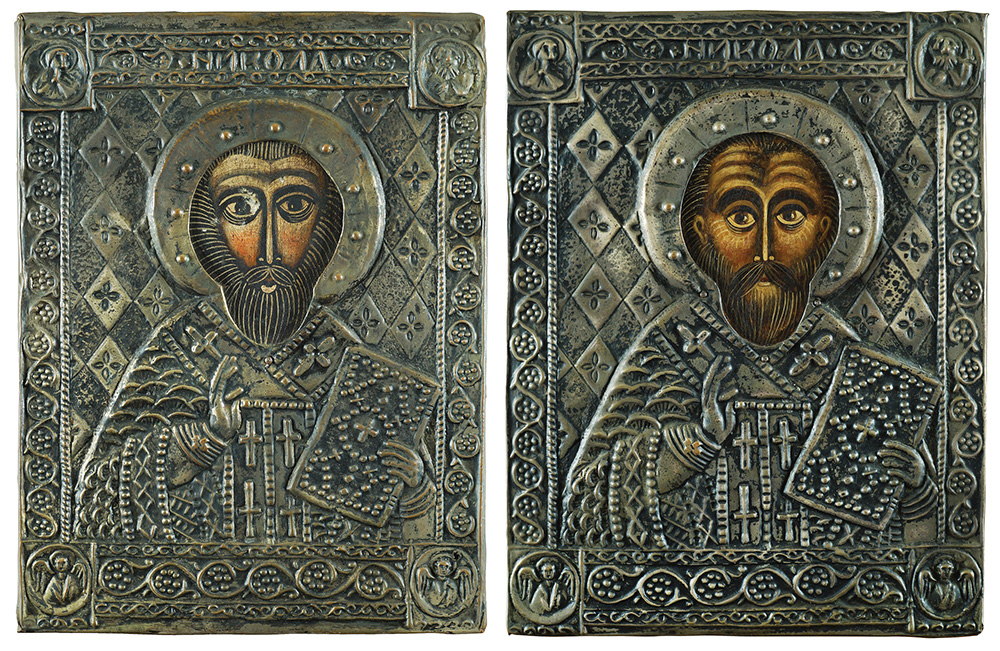 raffiguranti San Nicola di Myra, montate su cornici in ottone e vetro