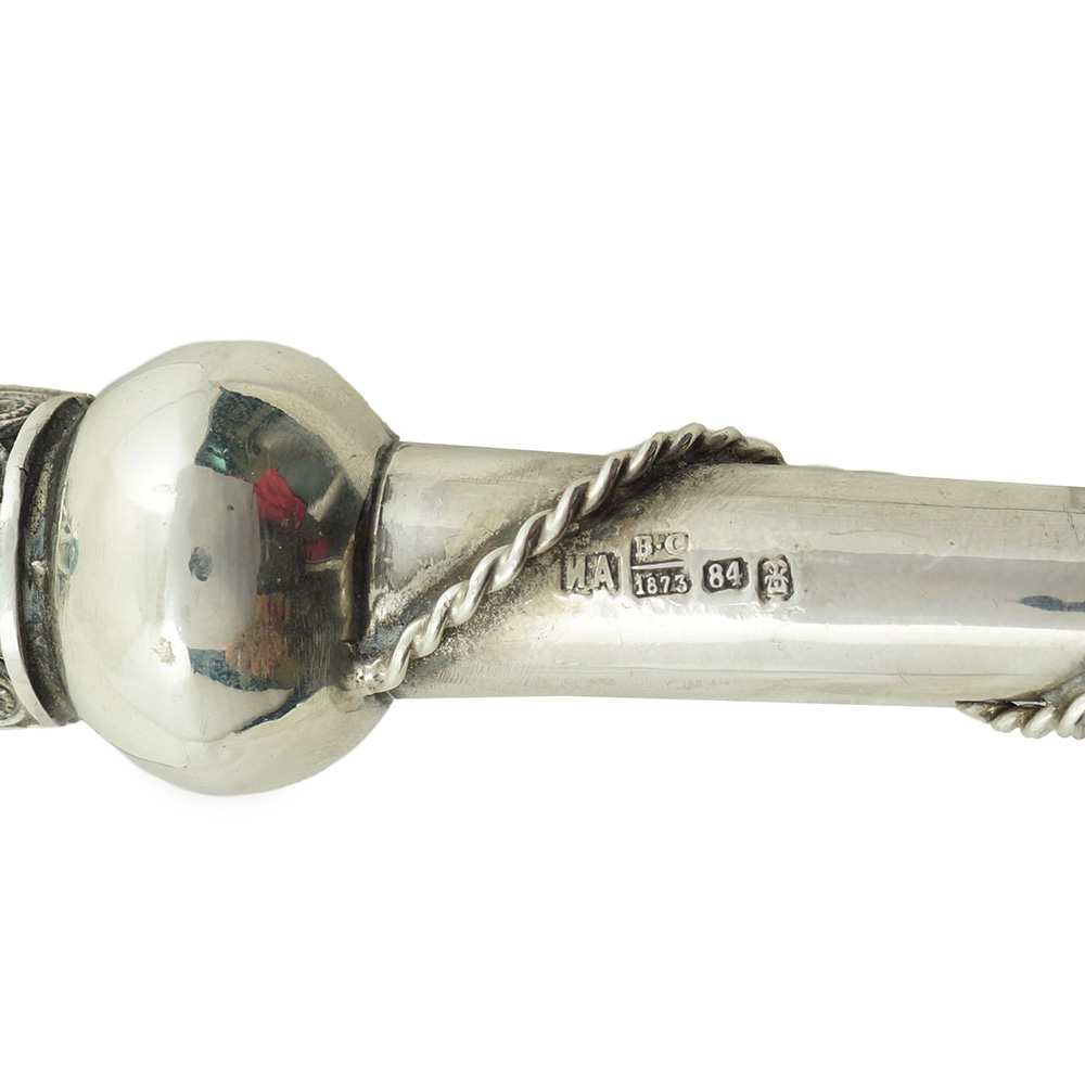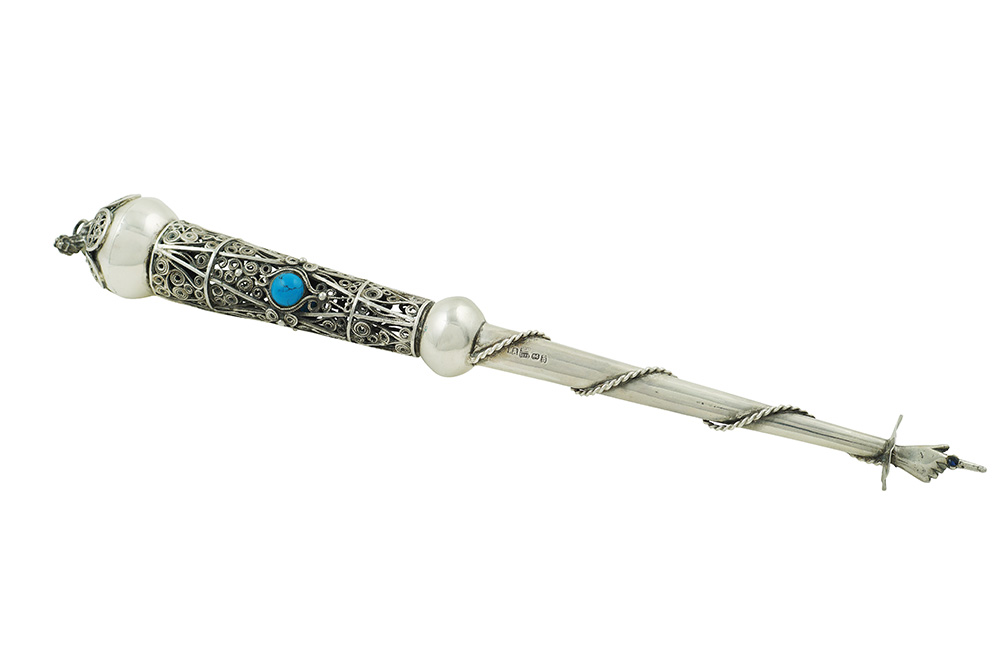 Yad in argento con pietre turchesi Mosca 1873 l. 29 cm. parzialmente traforato con presa sormontata da un leone, peso gr. 88