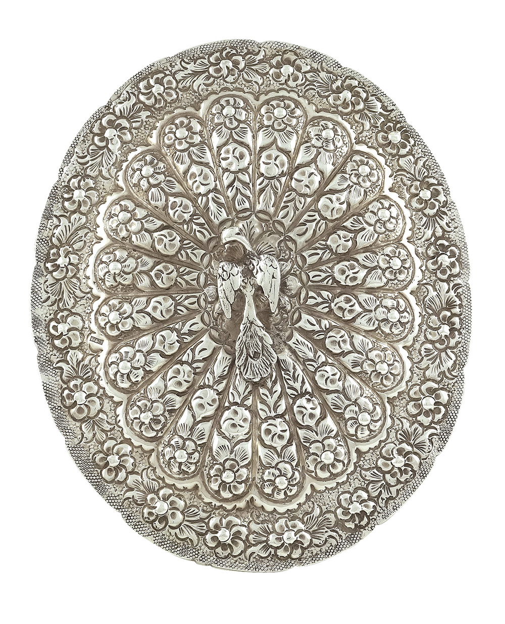 Specchio in argento da harem Turchia, fine XIX Sec. 19x15,5 cm. di forma ovale, sbalzato e decorato a motivi floreali con presa a forma di pavone