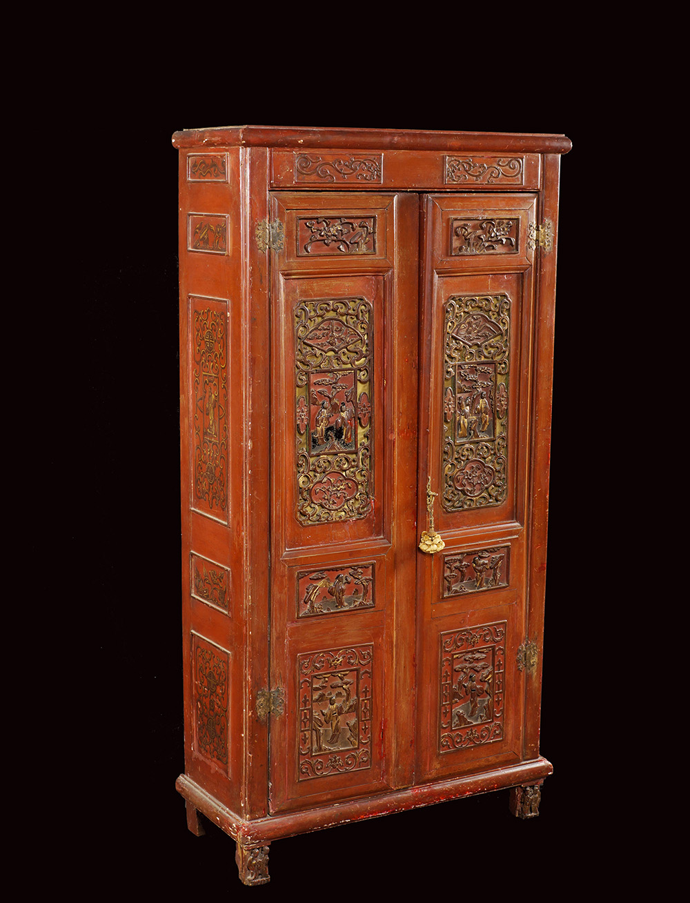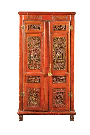Armadio in legno laccato e parzialmente dorato Cina, inizio XIX Sec. 151x75x32,5 cm. a due ante intagliate e decorate a motivi naturalistici con personaggi, fianchi bugnati e dipinti, difetti e restauri
