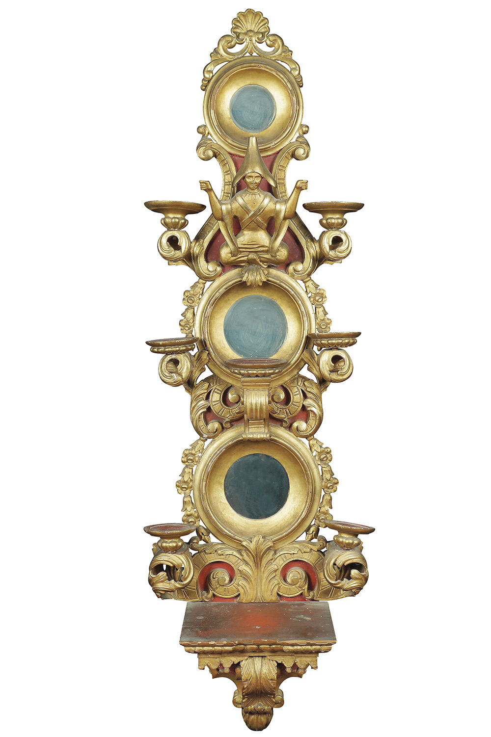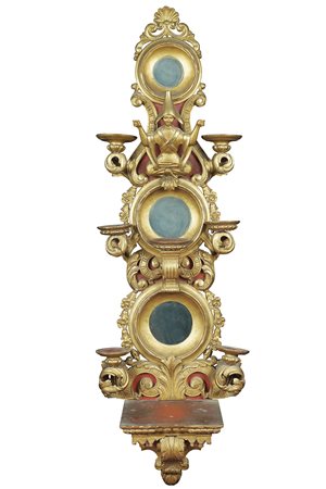 Particolare mensola da parete in legno dorato ed intagliato Francia, XIX Sec. 145x23 cm. parzialmente laccata rossa, decorata a motivi orientali e vegetali, lievi mancanze