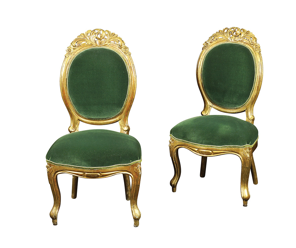 Coppia di sedie in legno dorato Francia, XIX Sec. h. 102 cm. intagliato a motivi vegetali, sedute e schienali imbottiti e rivestiti in tessuto, lievi difetti