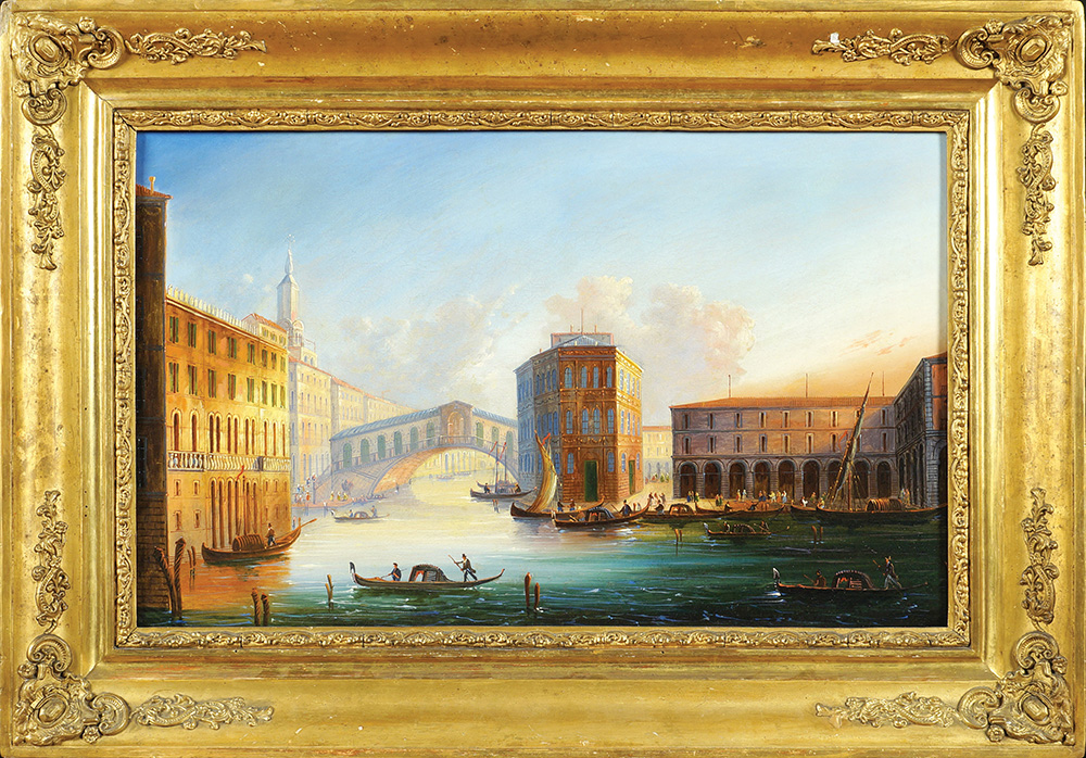 Carlo Bossoli, attribuito a Lugano 1815 - Torino 1884 40x63 cm. "Veduta del Canal Grande con il Ponte di Rialto", olio su tela, entro cornice in legno dorato