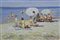 Giorgio Luxardo (Zara, 1930) BAGNANTI CON OMBRELLONI Olio su cartone telato, cm. 20x30 Firma in basso a destra. Sul verso: titolo e firma.