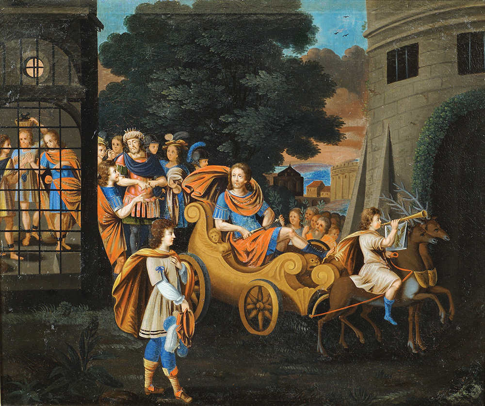 Lotto 598 | Scuola francese XIX Sec. 75,5x91,5 cm. "Alessandro Magno entra a Babilonia",...