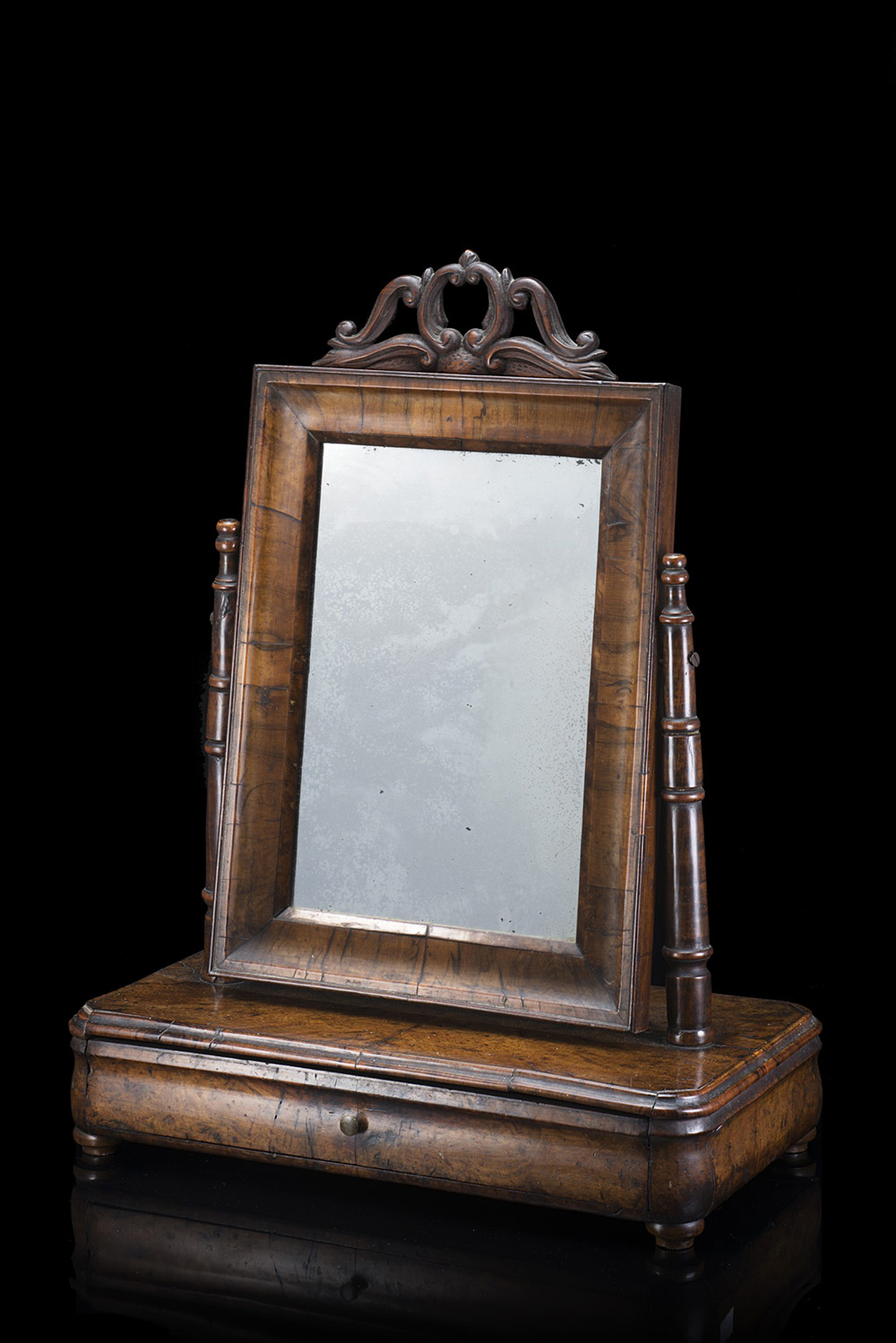Psiche da tavolo con specchio basculante decorata da cimasa intagliata e traforata. Montanti torniti poggiante su base con un cassetto. Sec. XIX (cm 44x60x25) (difetti) 19th-century cheval table mirror (defects)