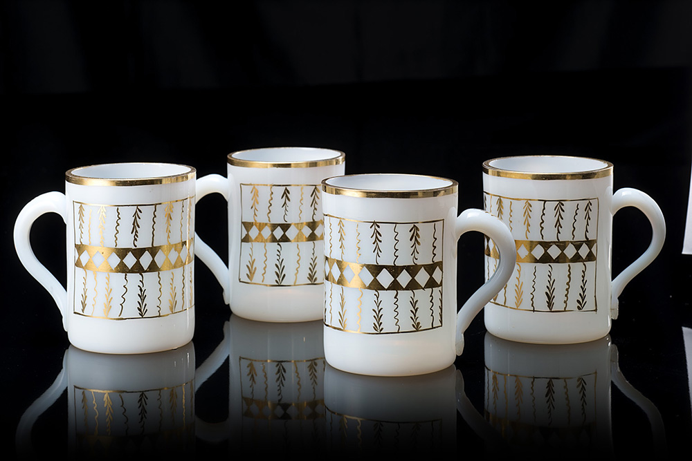 Quattro tazzine cilindriche da caffË in vetro lattimo con manici a ricciolo. Decorazione di gusto tardo Impero in oro (h. cm 8,8) Sec. XIX 19th-century manufacture. Group of four small mugs (defects)