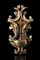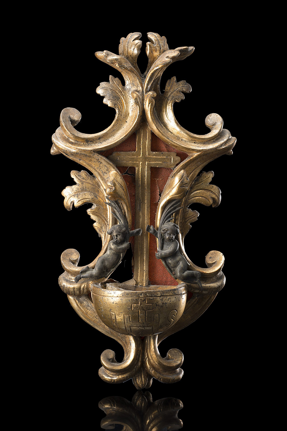 Acquasantiera in legno scolpito e dorato a volute, motivi fogliati e riccioli, decorato con applicazioni in metallo con putti reggipalma. Vaschetta in vetro. Sec. XIX (h. cm 35) (difetti) 19th-century giltwood holy water font (defects)