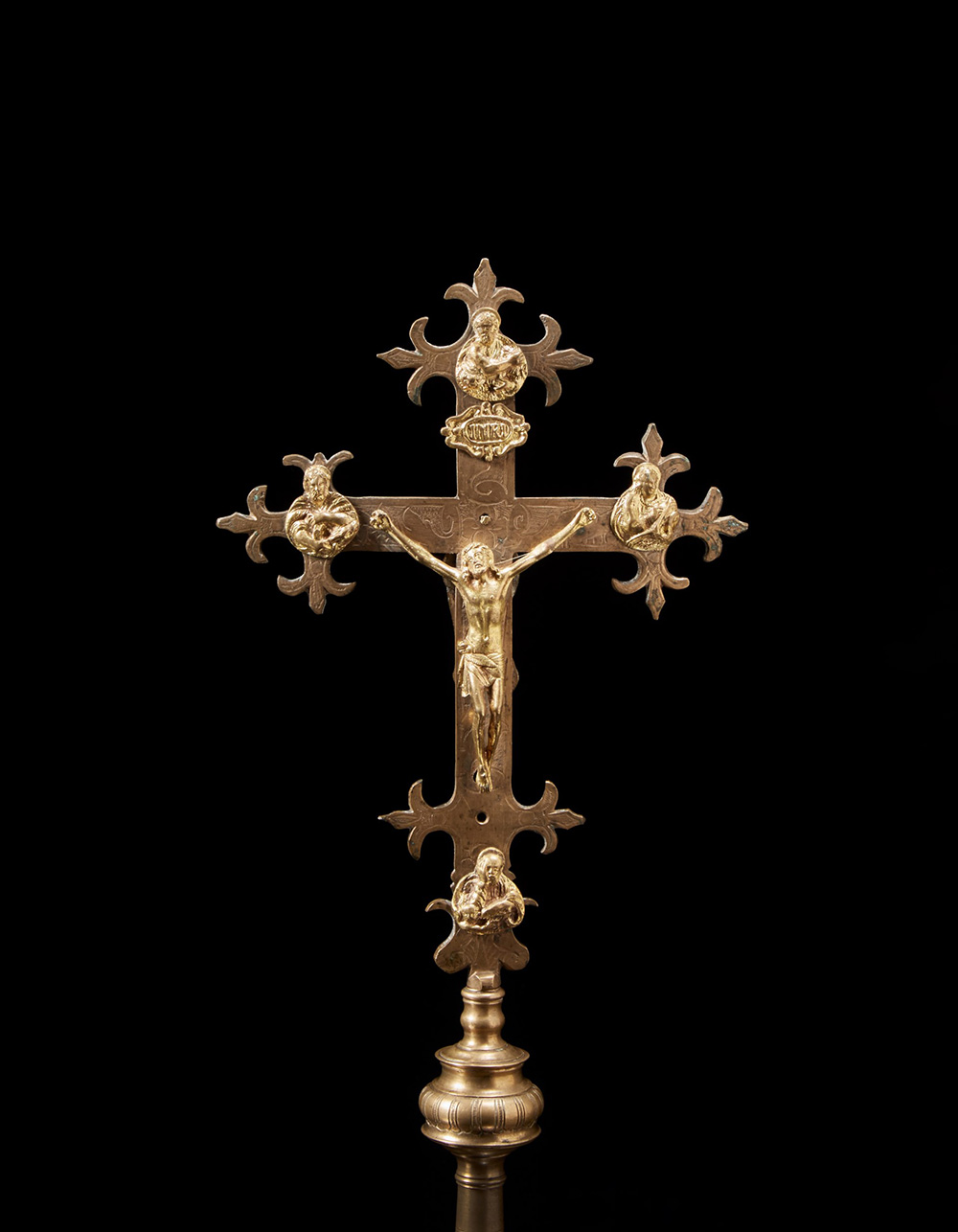 Croce astile in bronzo con puntali decorati a foglie e da fregi in bronzo dorato raffiguranti gli Evangelisti (h. cm 45) (mancanze) Bronze Crucifix (losses)