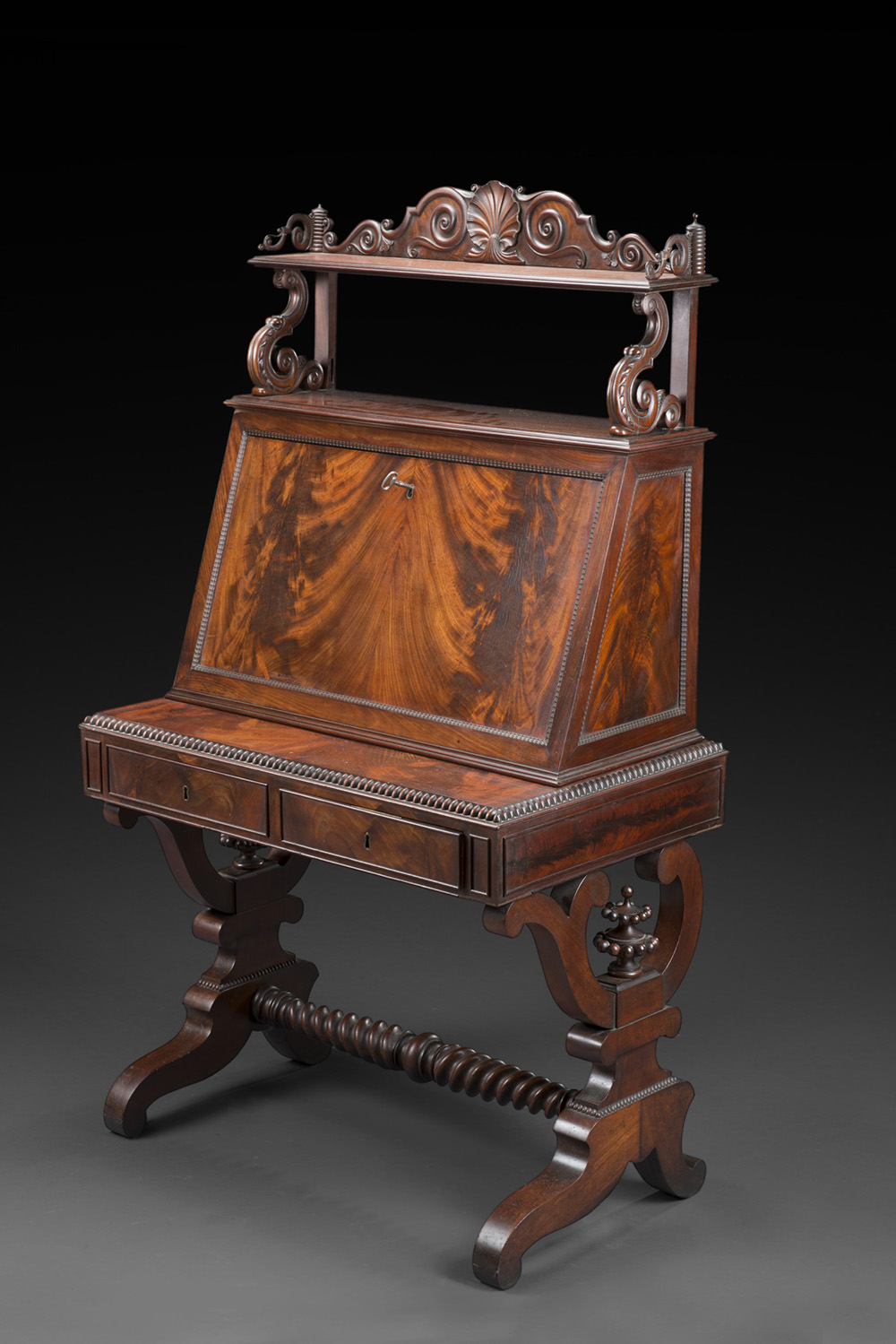 Mobile scrittoio da centro lastronato in mogano e piuma di mogano. Parte superiore a ripiani decorati da fregio centrale scolpito e montanti sagomati. Anta ribaltabile con cassettini e vani interni, due cassetti nella fascia. Gambe sagomate decorate da pinnacoli unite da traversa tornita. Etichetta "Bartolommeo Tani fabbricante di mobili in borgo S. Jacopo oltr'arno n. 1790. firenze". Sec. XIX (cm 56x150x53) (difetti e mancanze) 19th-century mahogany and feather mahogany veneered centre writing desk (defects and losses)