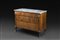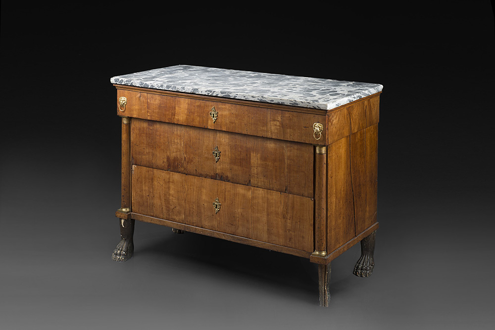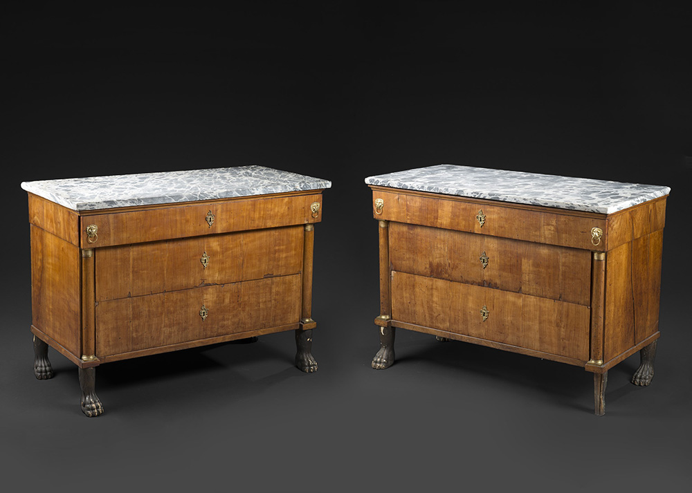 Coppia di comÚ lastronati in ciliegio a due cassetti e mezzo con montanti a mezza colonna tornita decorati da capitelli in bronzo dorato. Prese a teste leonine che sorreggono anelli. Piedi a zampa ferina in legno scolpito e laccato. Piano in marmo. Sec. XIX (cm 127x90x60) (mancanze) A pair of 19th-century cherrywood veneered commodes with marble tops (losses)
