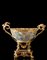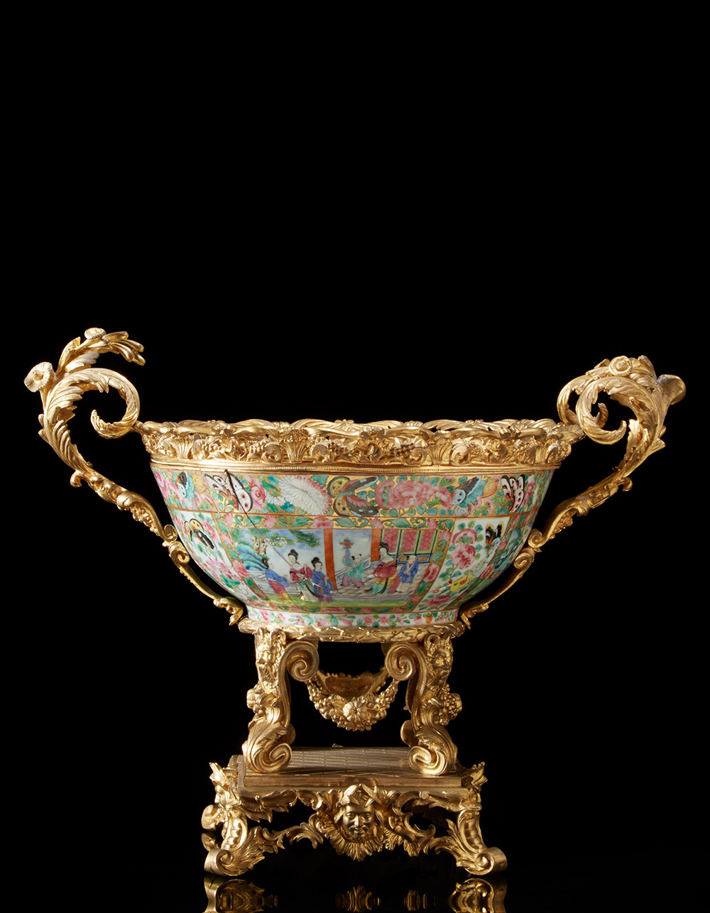 Alzata biansata in bronzo dorato e cesellato a grappoli d'uva, foglie e fiori. Contenente ciotola in porcellana Canton decorata a paesaggi e scene di vita, sorretta da volute a fiori e teste di fauno. Base squadrata decorata con teste laureate e motivi vegetali. Sec. XIX (cm 42x53x37) (gravi difetti) 19th-century gilt-bronze tazza with Canton porcelain bowl (major defects)