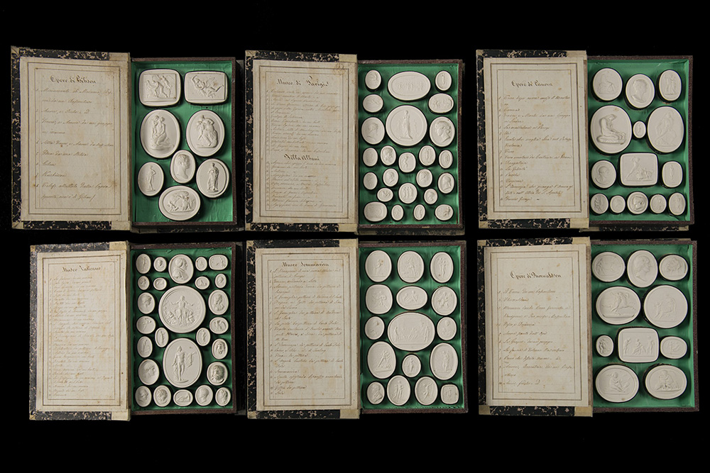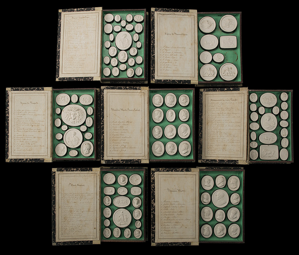 "Impronte" gruppo di tredici scatole a finti libri con legature in mezza pelle impressa in oro contenenti medaglioni raffiguranti opere d'arte presenti nei musei italiani, tra i quali i Musei Vaticani, Villa Sommariva, il Museo di Napoli e le Gipsoteche di Gibson e Canova. Seconde e terze di copertina con elenchi manoscritti descrittivi delle opere presenti (difetti e mancanze) Per questo lotto Ë disponibile l'Attestato di Libera Circolazione Liberotti Giovanni "Impronte" group of thirteen book-shaped boxes containing gypsum medallions depicting artworks of various Italian museum collections (defects and losses) Export license available for this lot