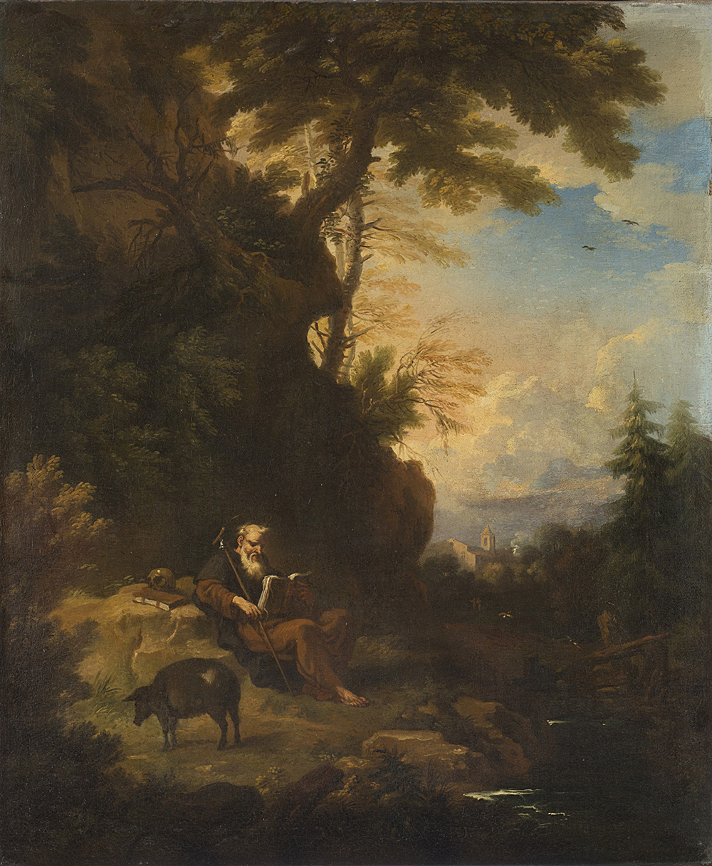 Scuola genovese del secolo XVIII "Sant'Antonio Eremita con paese sullo...