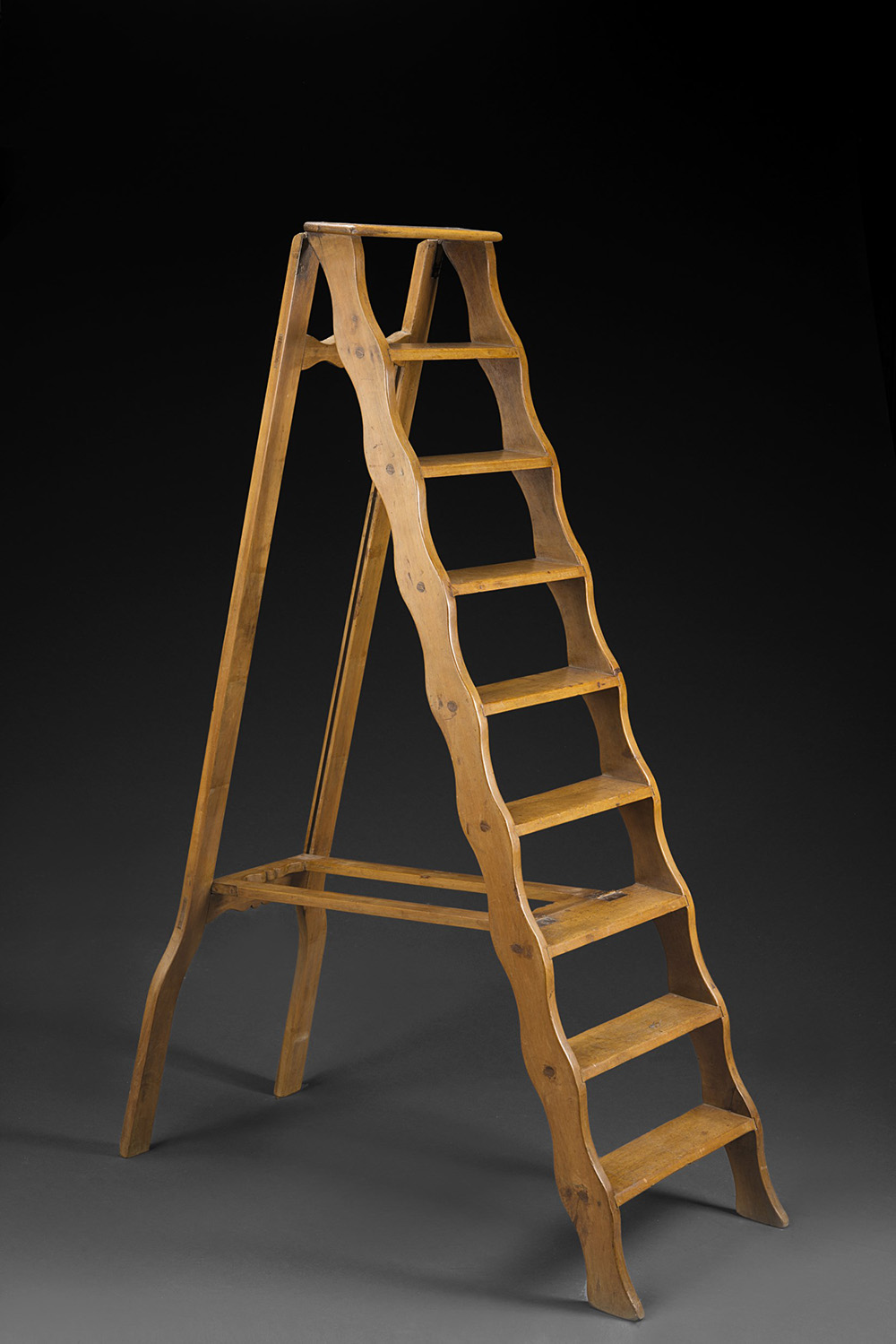 Scala pieghevole a otto piedini con montanti e crociera sagomati. Fine sec. XIX (h. cm 170) Late 19th-century wood ladder