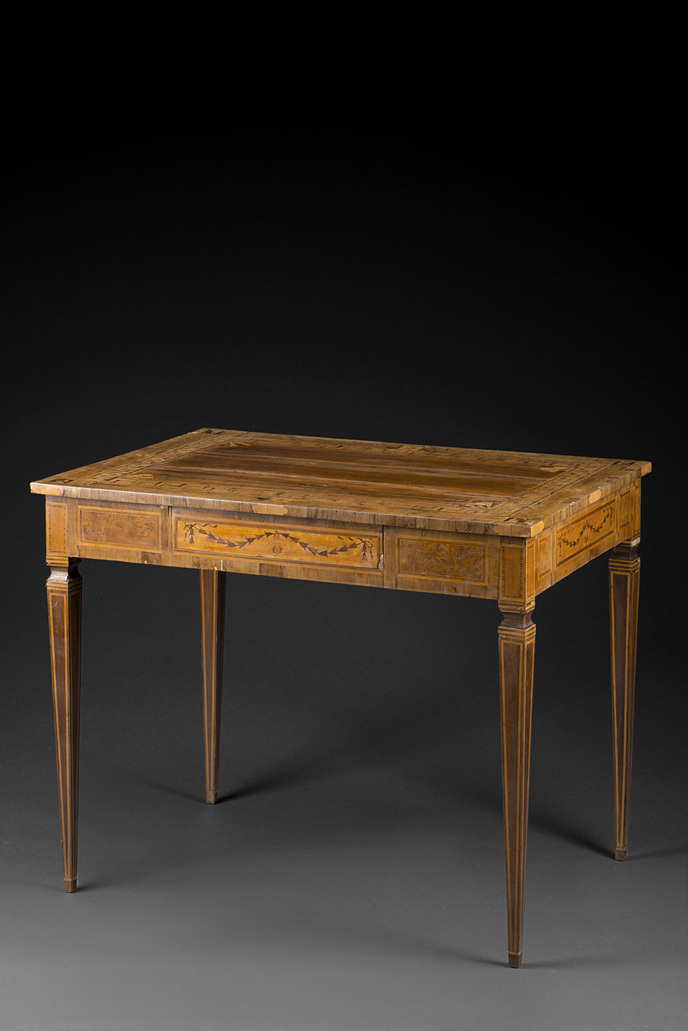 Tavolo da centro lastronato, radicato e filettato in legni vari, con piano intarsiato a greca, conchiglie stilizzate, rosoni e mascheroni con profili di guerrieri romani agli angoli. Fasce ad un cassetto. Gambe rastremate e filettate. Toscana, fine sec. XVIII (cm 96x76x72) (difetti e mancanze) Veneered and marquetry inlaid centre table. Tuscany, late 18th century (defects and restorations)