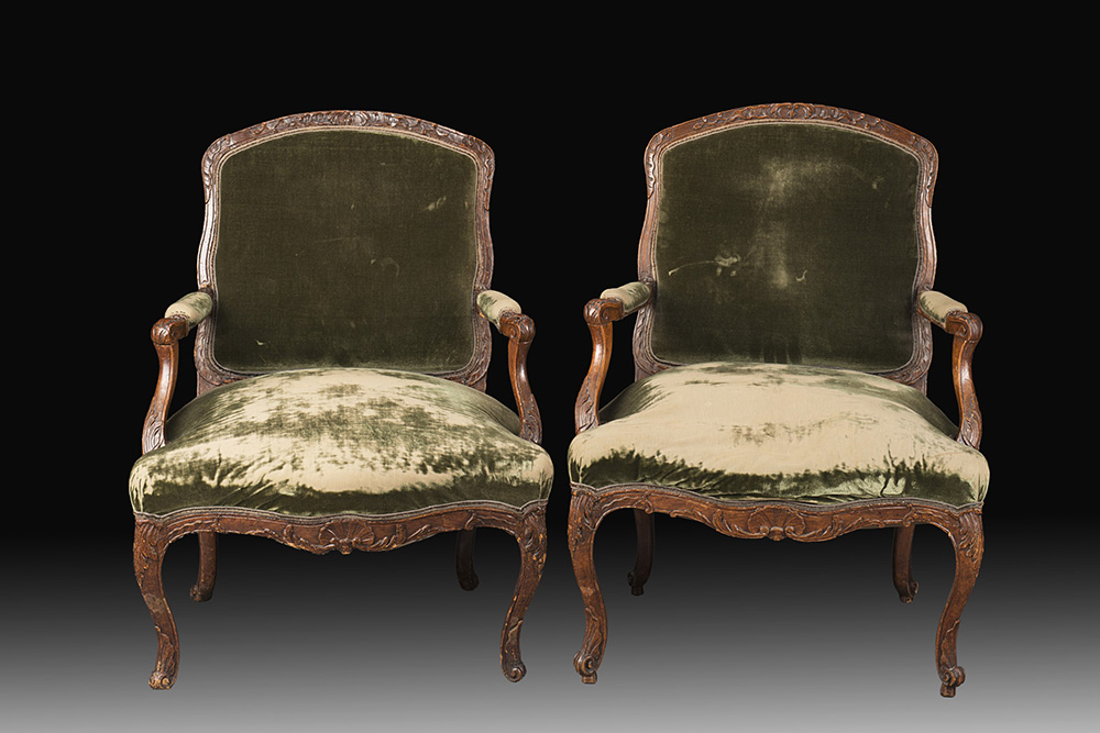 Coppia di poltrone con schienale e braccioli sagomati e intagliati a foglie e volute fogliate. Fasce e gambe mosse intagliate a motivi vegetali e valve di conchiglia. Rivestite in velluto verde. Sec. XVIII (difetti e usure) A pair of 18th-century wood armchairs (defects and wear)