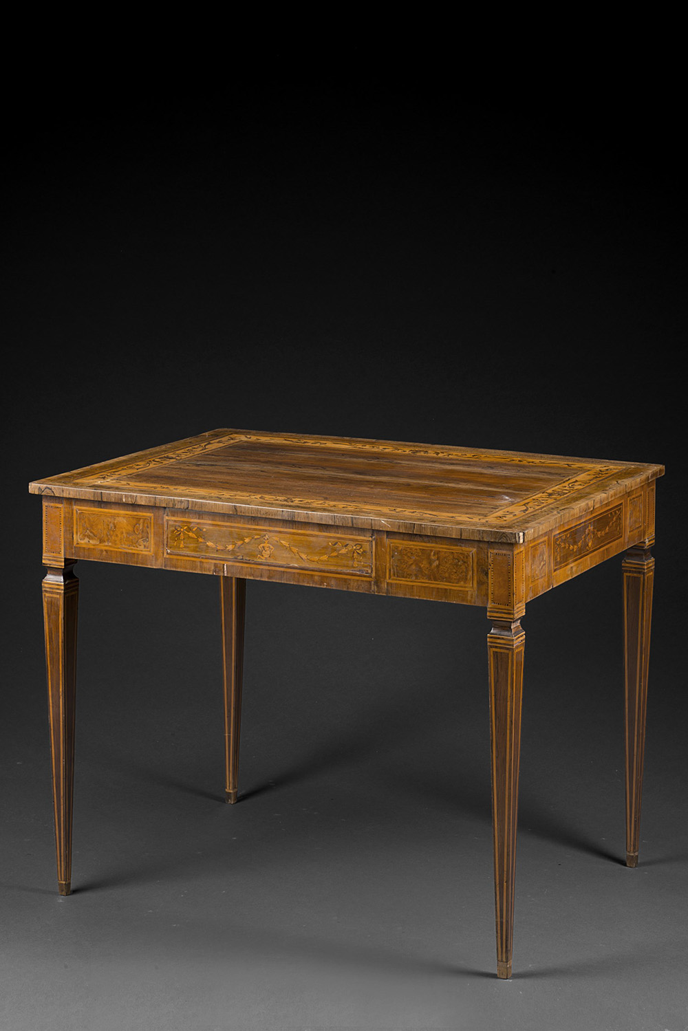 Tavolo da centro lastronato e filettato in legni vari, con piano intarsiato a vasi fioriti e volute fogliate. Fasce ad un cassetto sottopiano con specchiature in radica e figure che sorreggono festoni. Gambe rastremate e filettate. Toscana, fine sec. XVIII (cm 96x76x72) (difetti e mancanze) Veneered and marquetry inlaid centre table. Tuscany, late 18th century (defects and restorations)