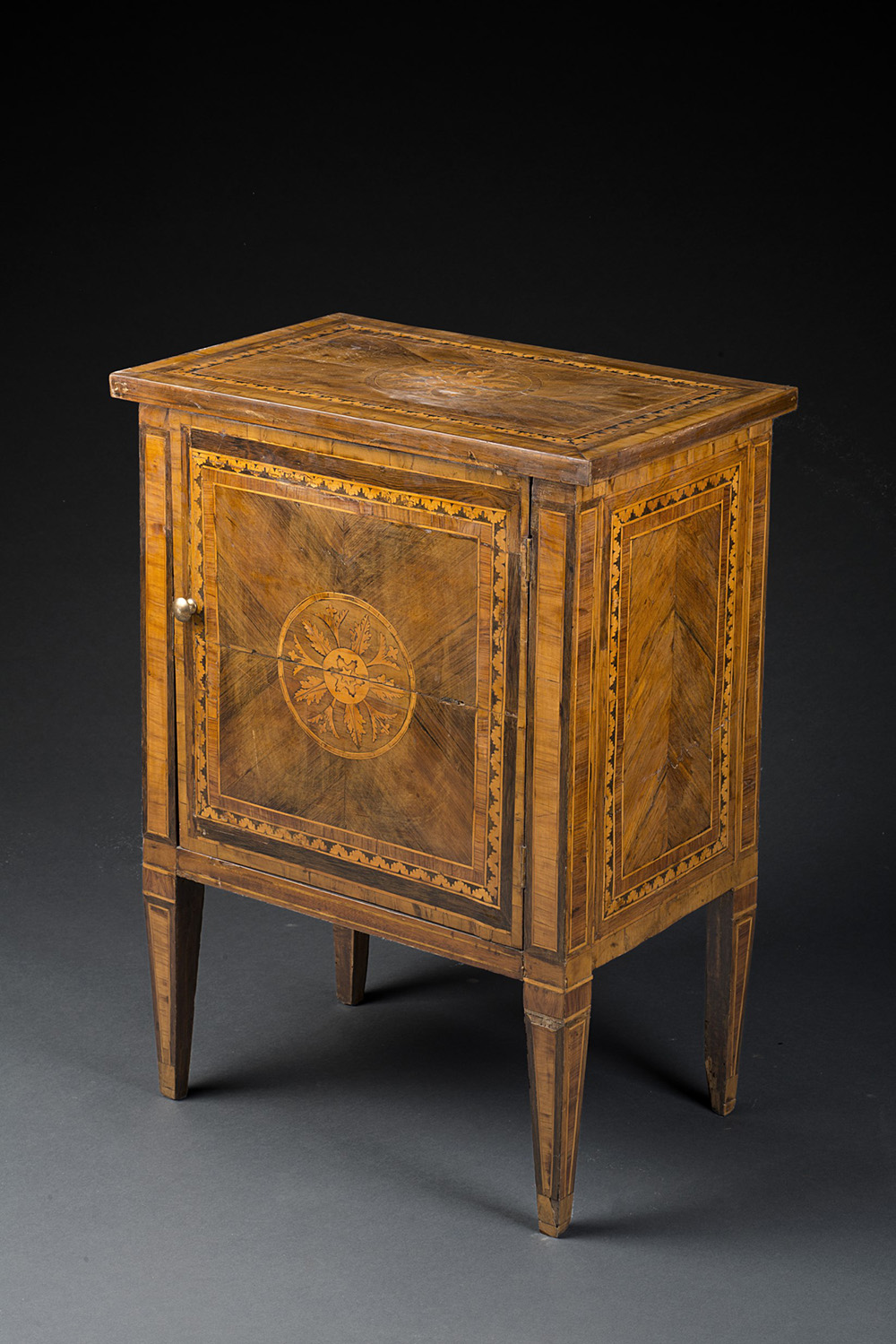 Comodino ad un'anta con piano, fronte e fianchi intarsiati e filettati in legni vari e a medaglioni con volute fogliate e fiori stilizzati. Piedi rastremati. Lombardia, sec. XVIII (cm 57x76x28) (rifacimenti e restauri) Marquetry inlaid bedside table. Lombardy, 18th century (restorations)