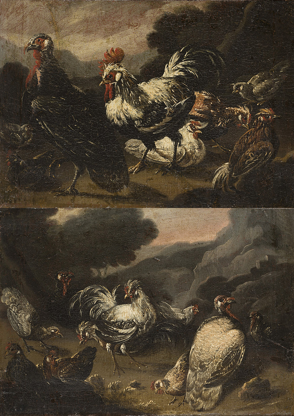 Scuola lombarda del secolo XVII "Animali da cortile" coppia di dipinti ad...