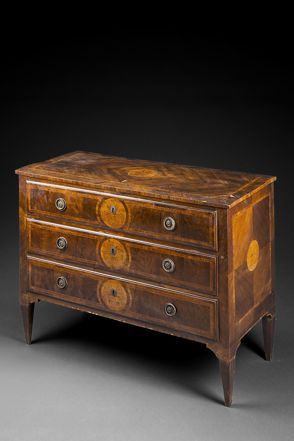 ComÚ in noce e radica a tre cassetti con fronte, fianchi e piano intarsiati con rosoni e filettati in legni vari. Gambe rastremate. Lombardia, sec. XVIII (cm 120x90x54) (difetti e restauri) Walnut and burr walnut commode. Lombardy, 18th century (defects and restorations)
