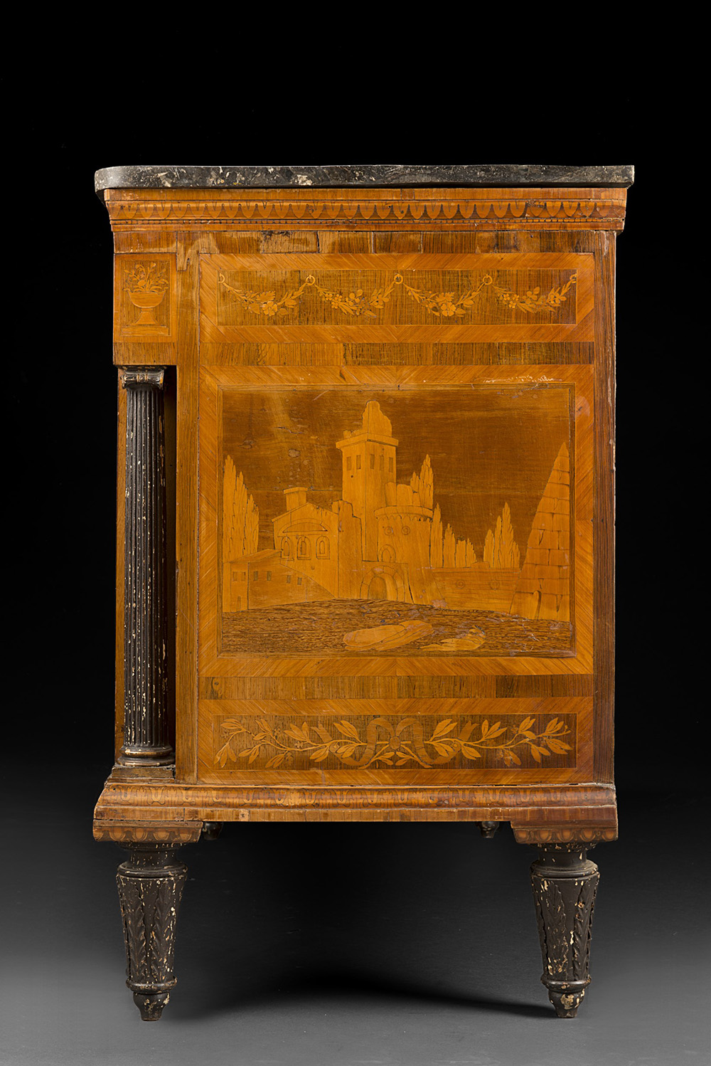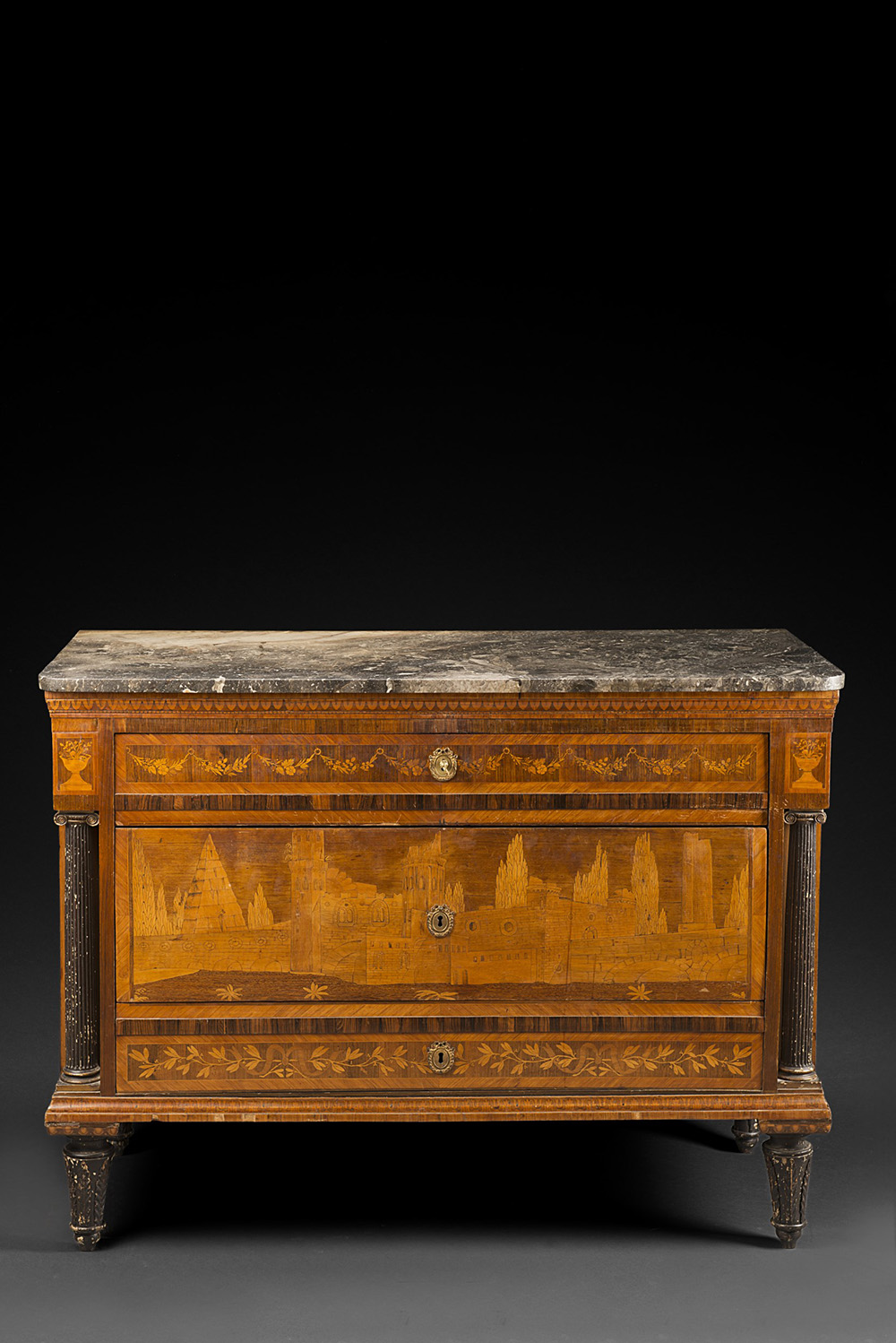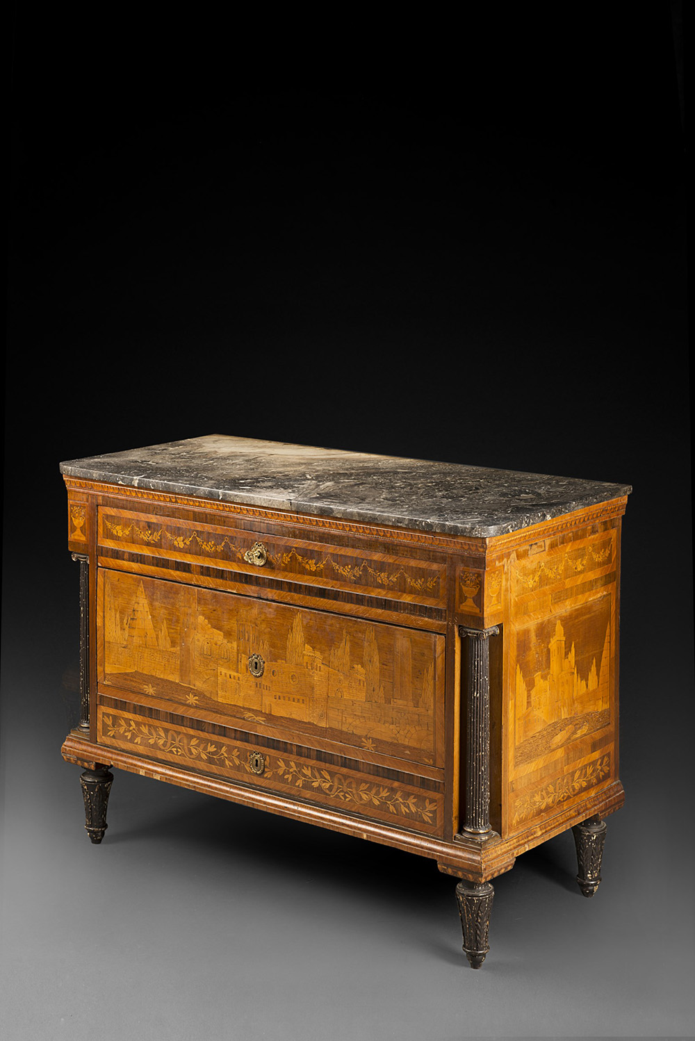 ComÚ lastronato in noce a tre cassetti con fronte e fianchi intarsiati in legni vari a paesaggi architettonici, vasi, volute con foglie e fiori. Montanti a colonne tornite e scanalate in legno laccato con capitelli dorati. Piedi sagomati decorati a foglie d'acanto. Piano in marmo (cm 129x97x60) (difetti, restauri e mancanze) Per la scheda completa si prega di consultare il catalogo cartaceo Giovanni Maffezzoli (Cremona 1774 - 1818) Marquetry inlaid walnut commode with marble top (defects, restorations, and losses)