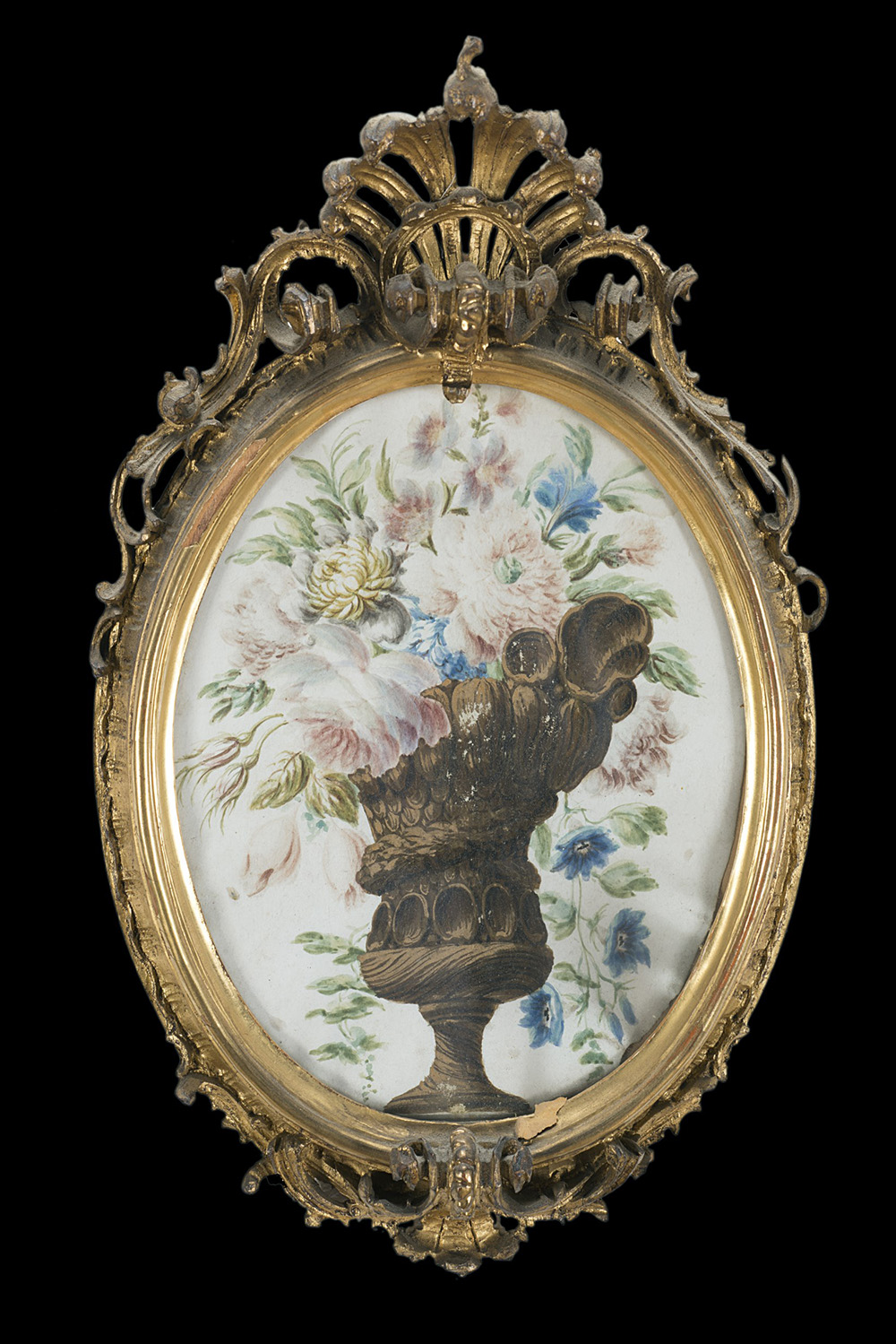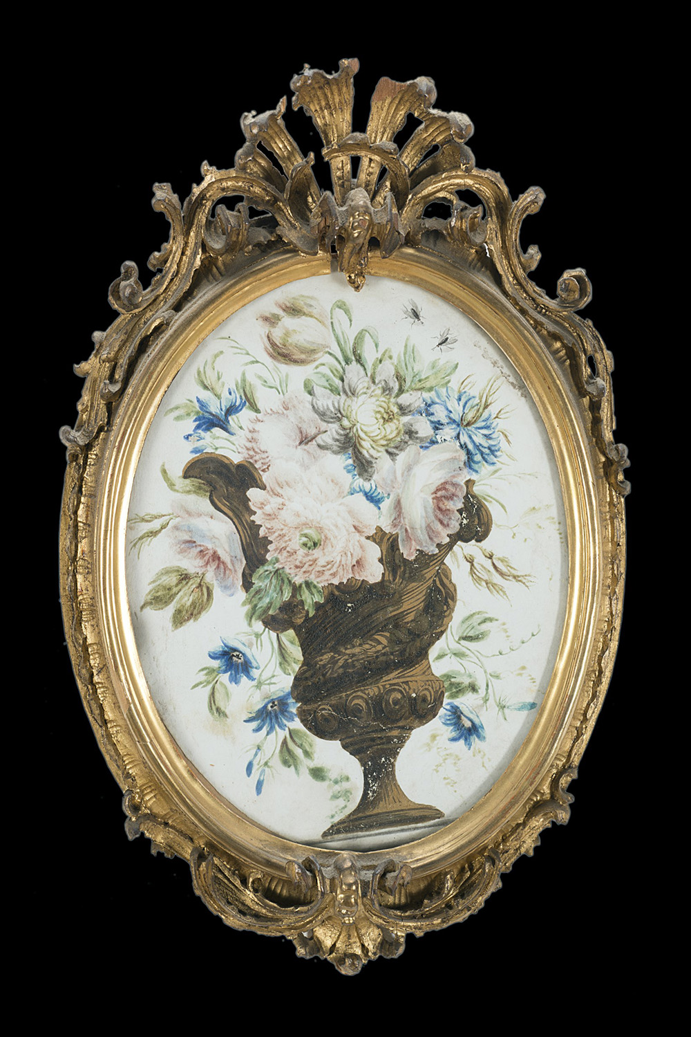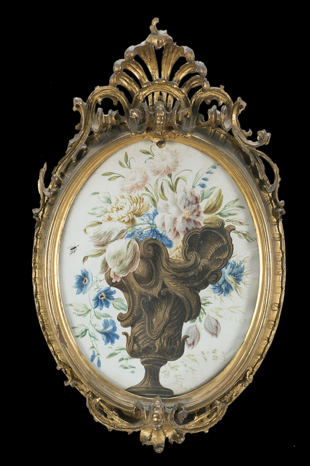 Scuola della fine del secolo XVIII "Vasi fioriti" gruppo di sei dipinti a tempera su pergamena ovale (cm 19x14) In cornici in legno intagliato, traforato e dorato (difetti) Late 18th-century school "Flowers in a vase" group of six tempera paintings on parchment. In carved giltwood frames (defects)