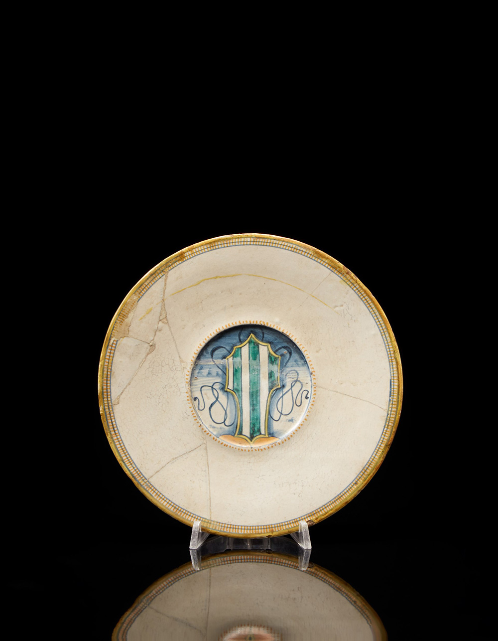 Piattello in maiolica con larga tesa bianca profilata da tre linee concentriche e leggero cavetto con stemma araldico a ëtesta di cavalloí con nastri svolazzanti, appoggiato su due monti contro un cielo blu (d. cm 21) Etichetta tonda di collezione sovrapposta ad altra rettangolare di vecchia collezione. Deruta, inizio sec. XVI (difetti e vecchi restauri) A small maiolica dish with a 'horse's head' coat of arms. Deruta, early 16th century (losses and old restorations)