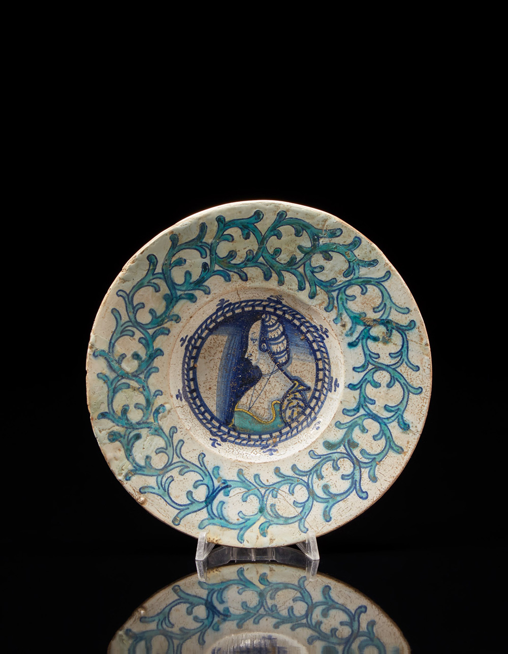 Piccolo piatto in maiolica policroma a larga tesa con decoro a ghirlanda vegetale verde ëa corona di spineí. Al centro del cavetto profilato da cornice in blu, Ë dipinto un profilo femminile (d. cm 23,3) Vecchia etichetta tonda di collezione ed altra etichetta con ëEsposto alla Mostra dellíAntiquariato di Milano 19 nov . - 13 dic. 1960í. Deruta, prima met‡ del sec. XVI (estese rotture e difetti di cottura) A small polychrome maiolica dish with a 'crown of thorns' decoration. Deruta, first half of 16th century (several losses and kiln defects) La decorazione ëa corona di spineí, due tralci vegetali verdi intrecciati, Ë uno dei decori per bordi pi˘ tipici della produzione di Deruta della prima met‡ del XVI secolo. Insieme al tralcio ricurvo di fiore di bigonia, i motivi arabescati e la ghirlanda formata da ovuli continui, circondano ed inquadrano innumerevoli temi centrali.