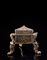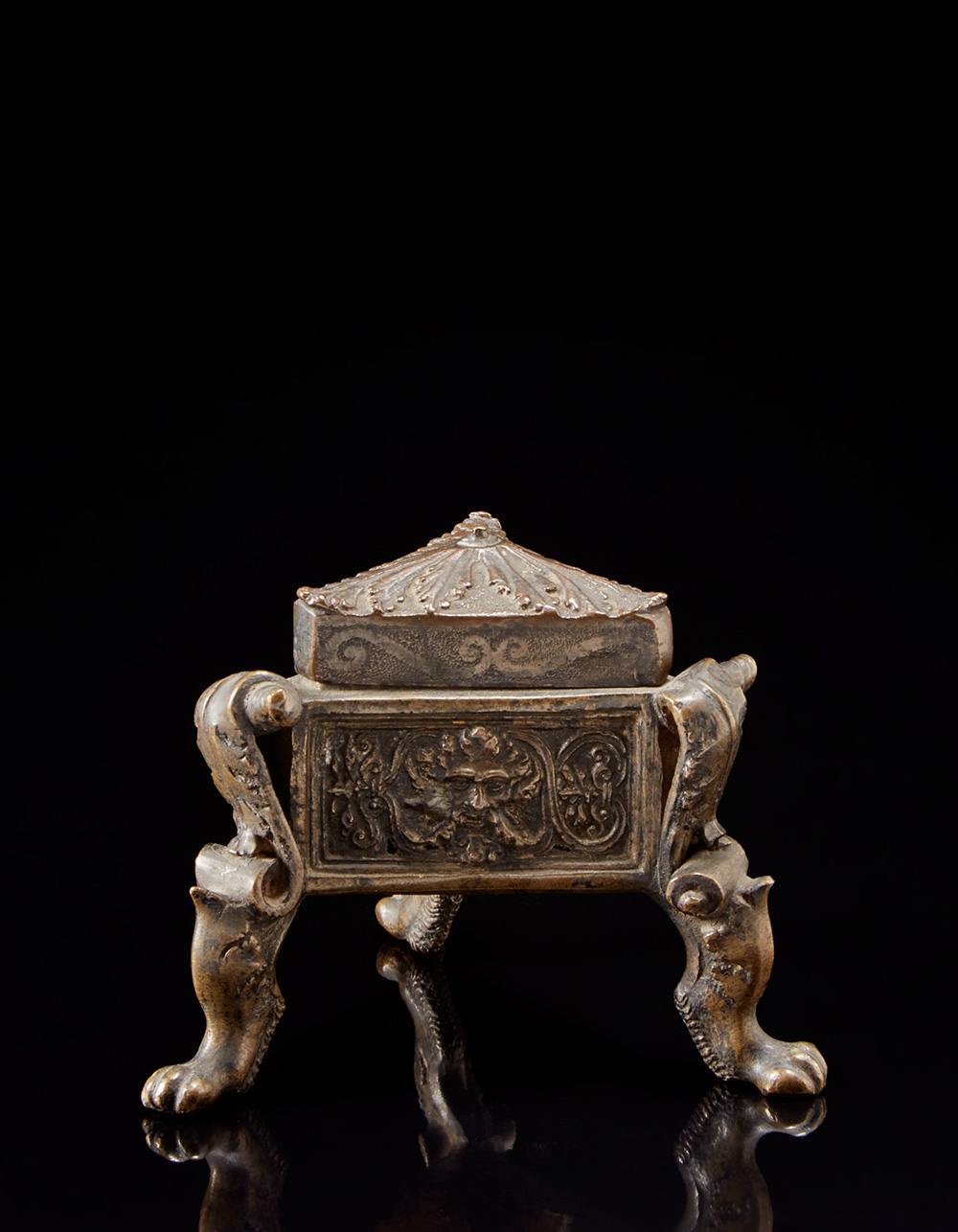 Arte veneta inizio sec. XVII. Calamaio in bronzo di forma triangolare con coperchio decorato a foglie d'acanto, fasce con tracce d'incisione. Corpo decorato da fasce in rilievo a volti di fauni e fregi. Montanti sagomati con piedi ferini (h. cm 10) (difetti e mancanze) 17th-century Venetian art. Bronze inkwell (defects and losses)