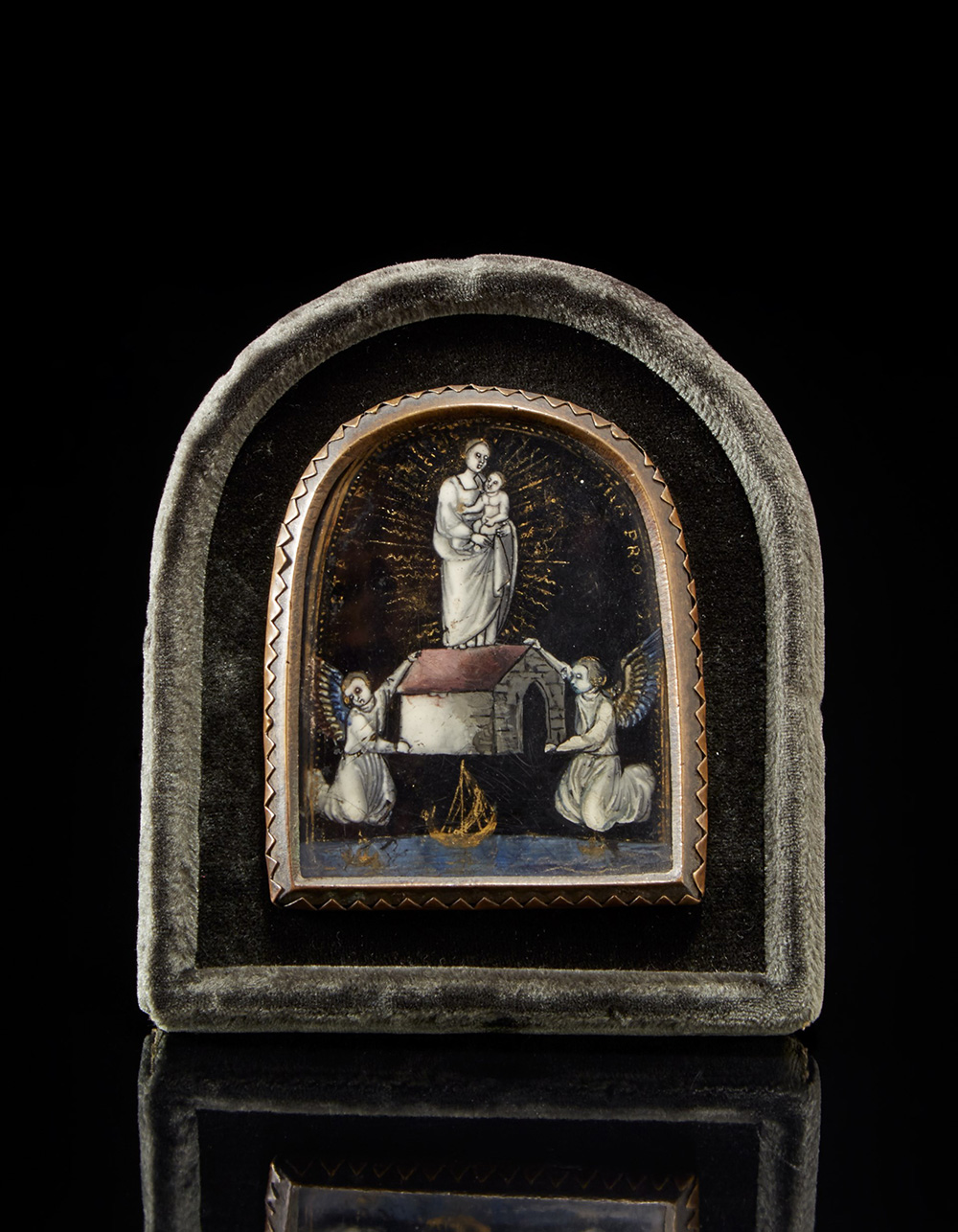 Manifattura di Limoges, sec. XVI. Pace in rame smaltato di forma sagomata raffigurante la Madonna di Loreto (cm 8x6,5) Montato su pannello in velluto di epoca posteriore (lievi difetti, inscrizione sul bordo consunta) Limoges manufactory, 16th century. Copper pax depicting the Madonna of Loreto. Panel of a later date (minor defects, wear to the inscription)
